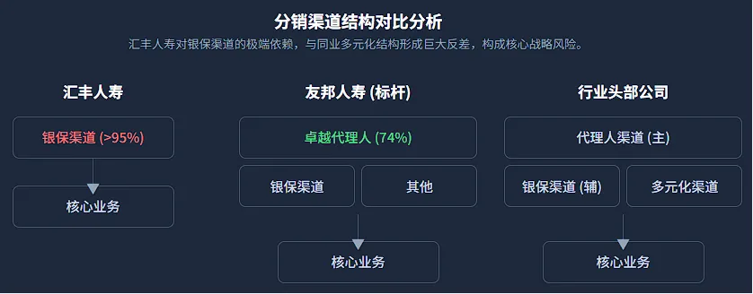 与同业的对比: 这种模式体现了公司在探索自身“高质量发展”道路上的独特选择。相较于行业内以代理人渠道为核心的发展模式,汇丰人寿专注于其银保渠道的深度耕耘,这使其在产品销售的深度、客户关系的粘性以及价值创造能力上,形成了与主流模式不同的发展路径和特点。