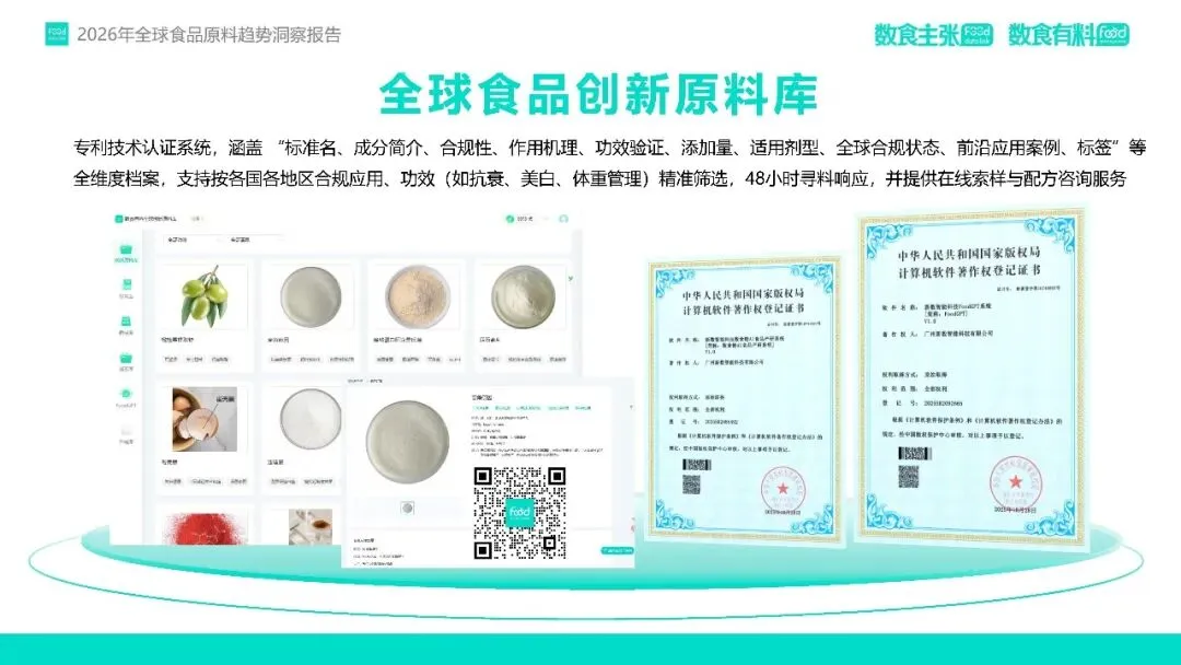 专利技术认证系统,涵盖 “标准名、成分简介、合规性、作用机理、功效验证、添加量、适用剂型、全球合规状态、前沿应用案例、标签”等全维度档案,支持按各国各地区合规应用、功效(如抗衰、美白、体重管理)精准筛选,48小时寻料响应,并提供在线索样与配方咨询服务