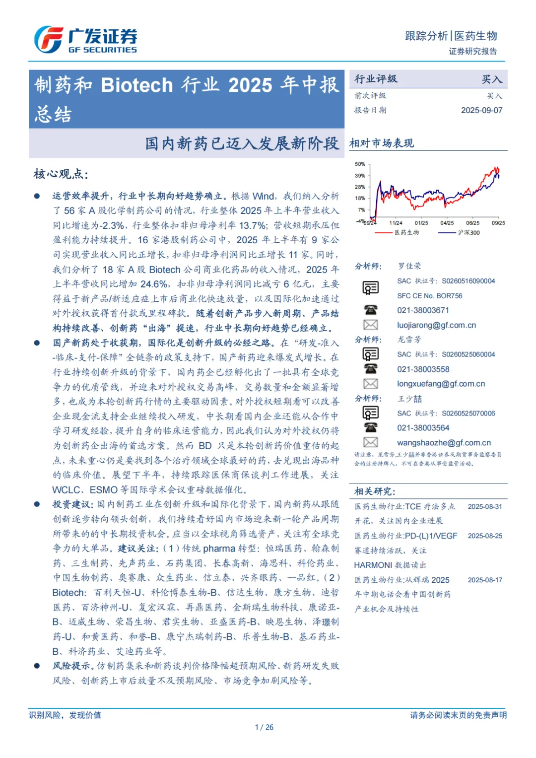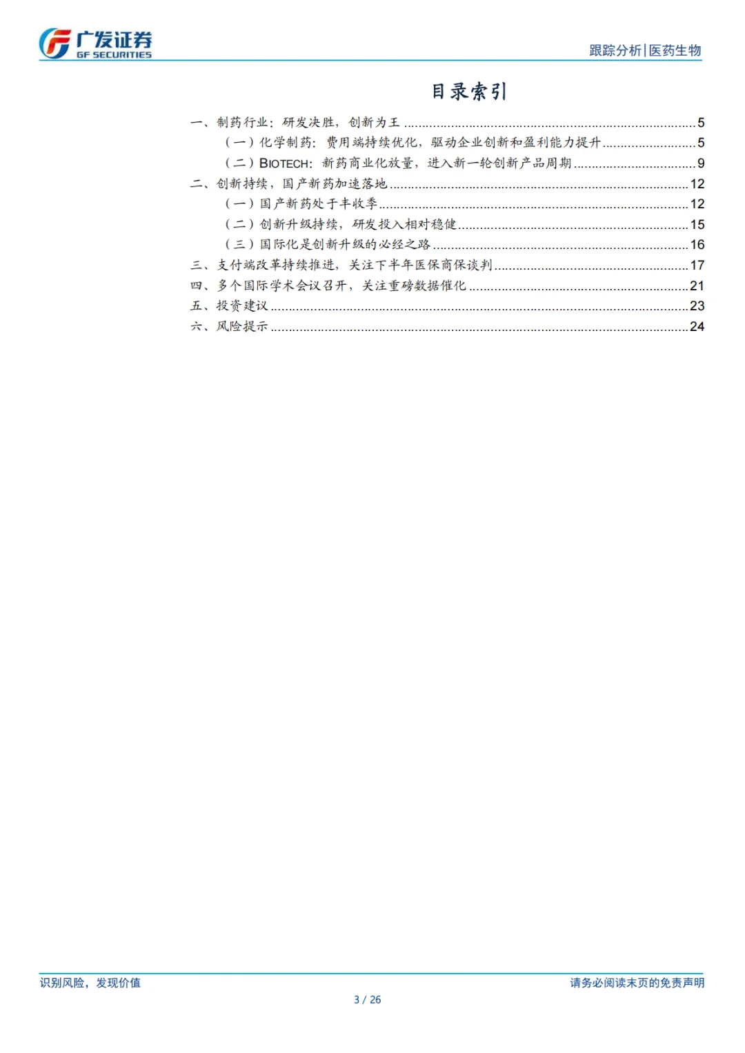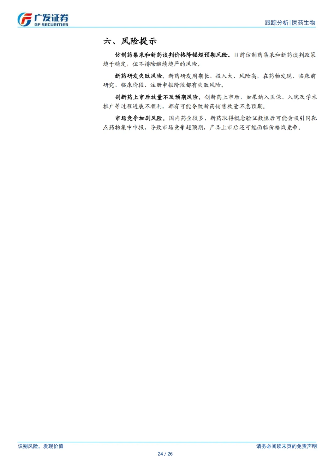 ⚫ 风险提示。仿制药集采和新药谈判价格降幅超预期风险、新药研发失败风险、创新药上市后放量不及预期风险、市场竞争加剧风险等。