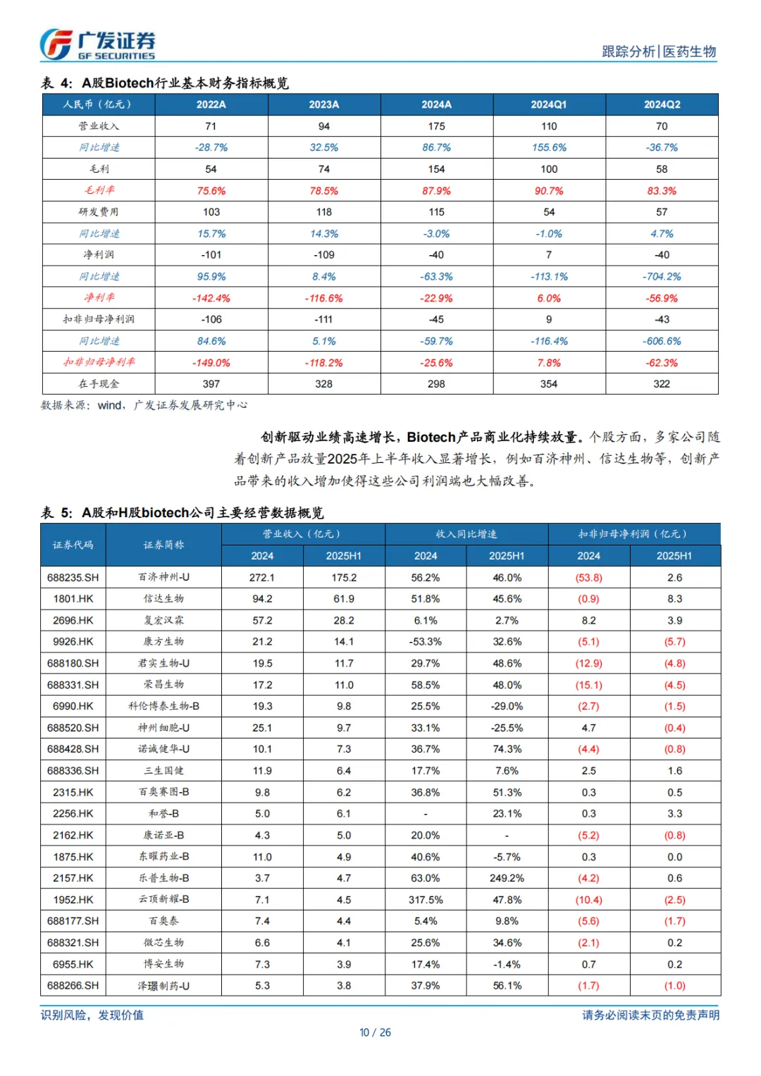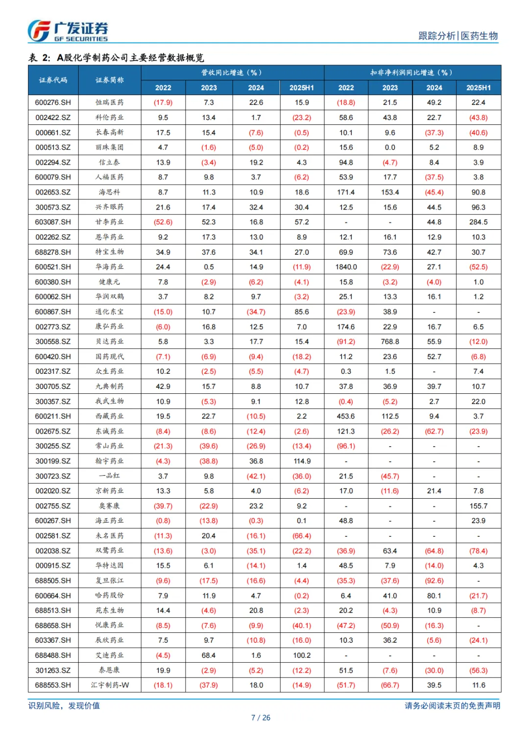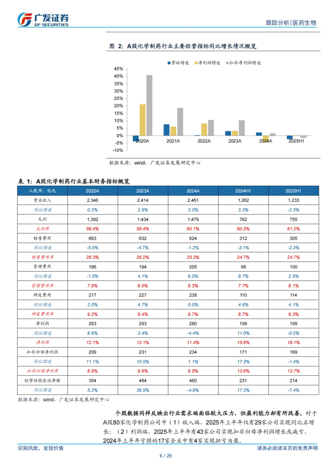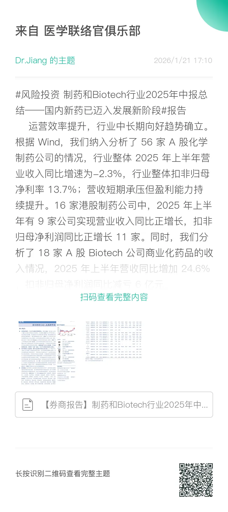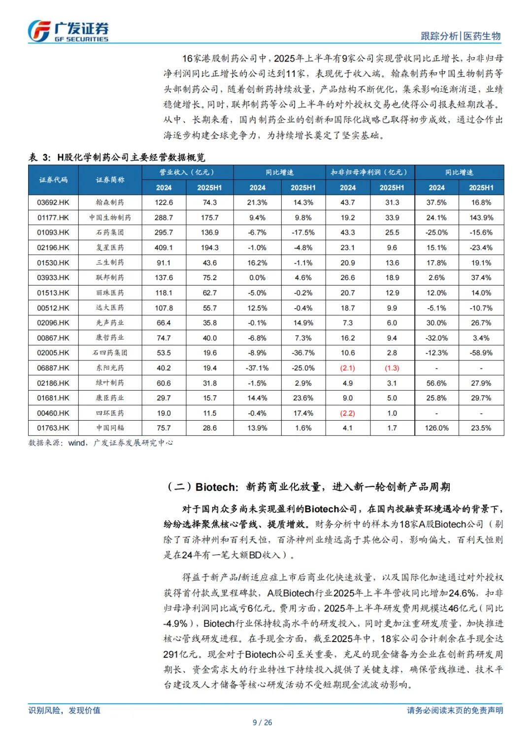 ⚫ 运营效率提升,行业中长期向好趋势确立。根据 Wind,我们纳入分析了 56 家 A 股化学制药公司的情况,行业整体 2025 年上半年营业收入同比增速为-2.3%,行业整体扣非归母净利率 13.7%;营收短期承压但盈利能力持续提升。16 家港股制药公司中,2025 年上半年有 9 家公司实现营业收入同比正增长,扣非归母净利润同比正增长 11 家。同时,我们分析了 18 家 A 股 Biotech 公司商业化药品的收入情况,2025 年上半年营收同比增加 24.6%,扣非归母净利润同比减亏 6 亿元,主要得益于新产品/新适应症上市后商业化快速放量,以及国际化加速通过对外授权获得首付款或里程碑款。随着创新产品步入新周期、产品结构持续改善、创新药“出海”提速,行业中长期向好趋势已经确立。