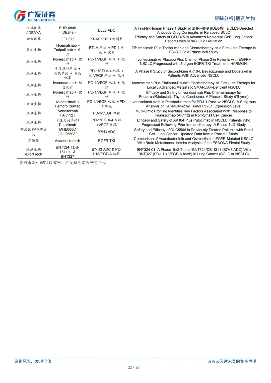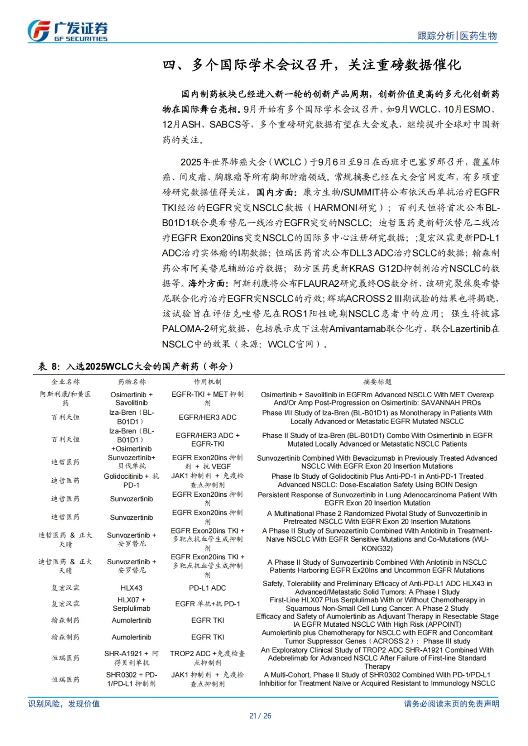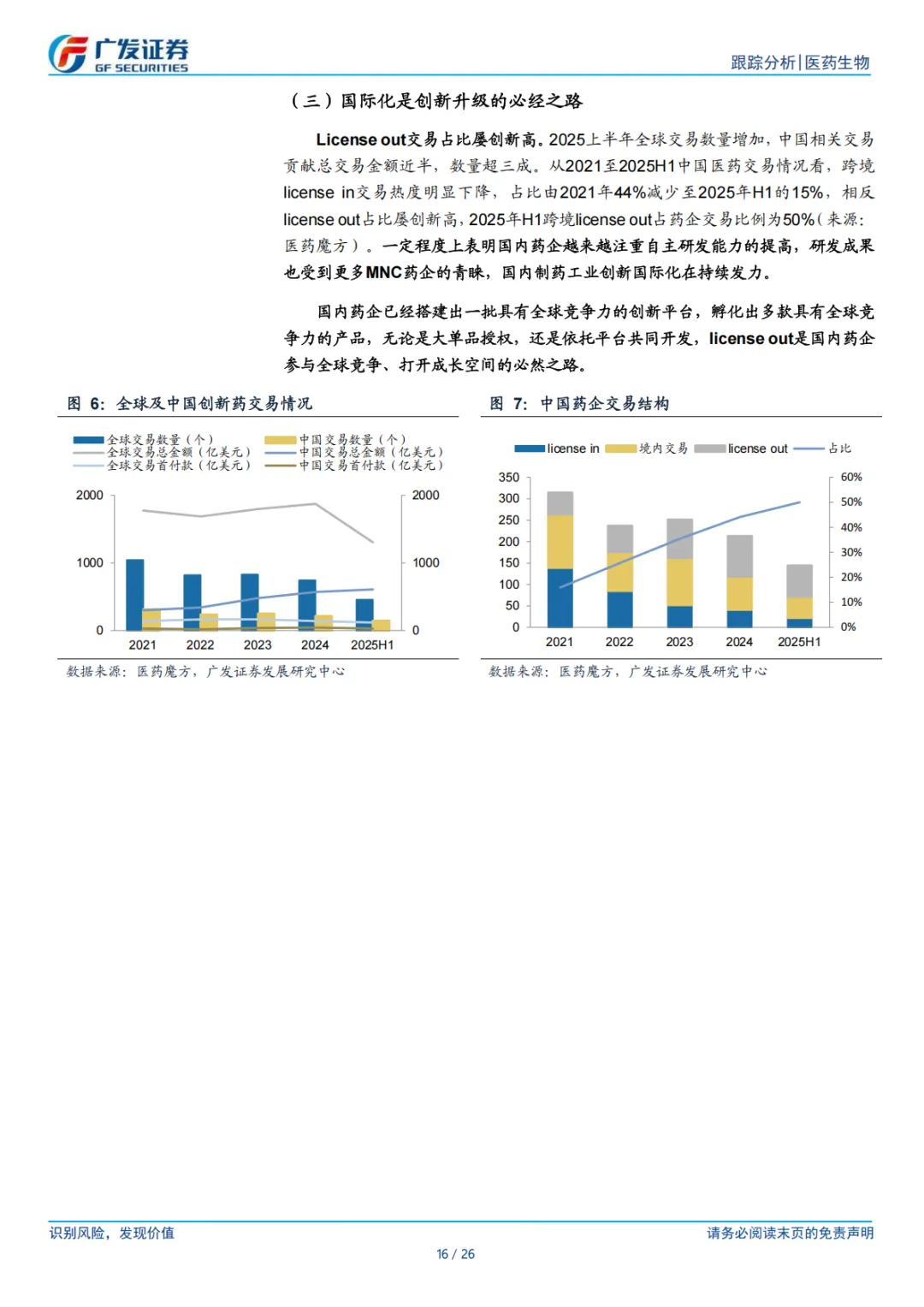 ⚫ 国产新药处于收获期,国际化是创新升级的必经之路。在“研发-准入-临床-支付-保障”全链条的政策支持下,国产新药迎来爆发式增长。在行业持续创新升级的背景下,国内药企已经孵化出了一批具有全球竞争力的优质管线,并迎来对外授权交易高峰,交易数量和金额显著增多,也成为本轮创新药行情的主要驱动因素。对外授权短期看可以改善企业现金流支持企业继续投入研发,中长期看国内企业还能从合作中学习研发经验,提升自身的临床运营能力,因此我们认为对外授权仍将为创新药企出海的首选方案。然而 BD 只是本轮创新药价值重估的起点,未来重心仍是要找到各个治疗领域全球最好的药,去兑现出海品种的临床价值。展望下半年,持续跟踪医保商保谈判工作进展,关注WCLC、ESMO 等国际学术会议重磅数据催化。