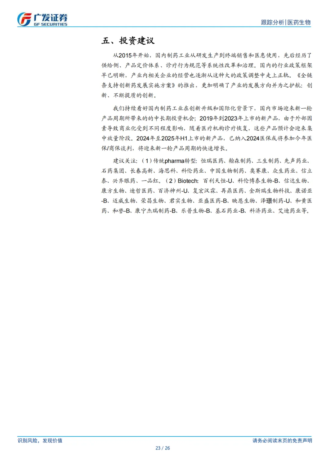 建议关注:(1)传统 pharma 转型:恒瑞医药、翰森制药、三生制药、先声药业、石药集团、长春高新、海思科、科伦药业、中国生物制药、奥赛康、众生药业、信立泰、兴齐眼药、一品红。(2)Biotech:百利天恒-U、科伦博泰生物-B、信达生物、康方生物、迪哲医药、百济神州-U、复宏汉霖、再鼎医药、金斯瑞生物科技、康诺亚-B、迈威生物、荣昌生物、君实生物、亚盛医药-B、映恩生物、泽璟制药-U、和黄医药、和誉-B、康宁杰瑞制药-B、乐普生物-B、基石药业-B、科济药业、艾迪药业等。