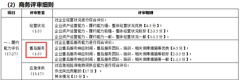 企业售后服务响应时间、售后服务团队、培训、相关保障措施等优良【4-5分】;企业售后服务响应时间、售后服务团队、培训、相关保障措施等较好【2-3.5分】;企业售后服务响应时间、售后服务团队、培训、相关保障措施等一般【1-1.5分】。