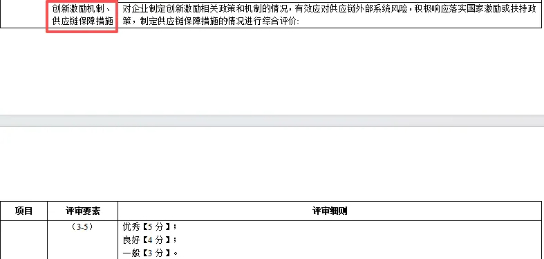 对企业制定创新激励相关政策和机制的情况,有效应对供应链外部系统风险,积极响应落实国家激励或扶持政策,制定供应链保障措施的情况进行综合评价:
