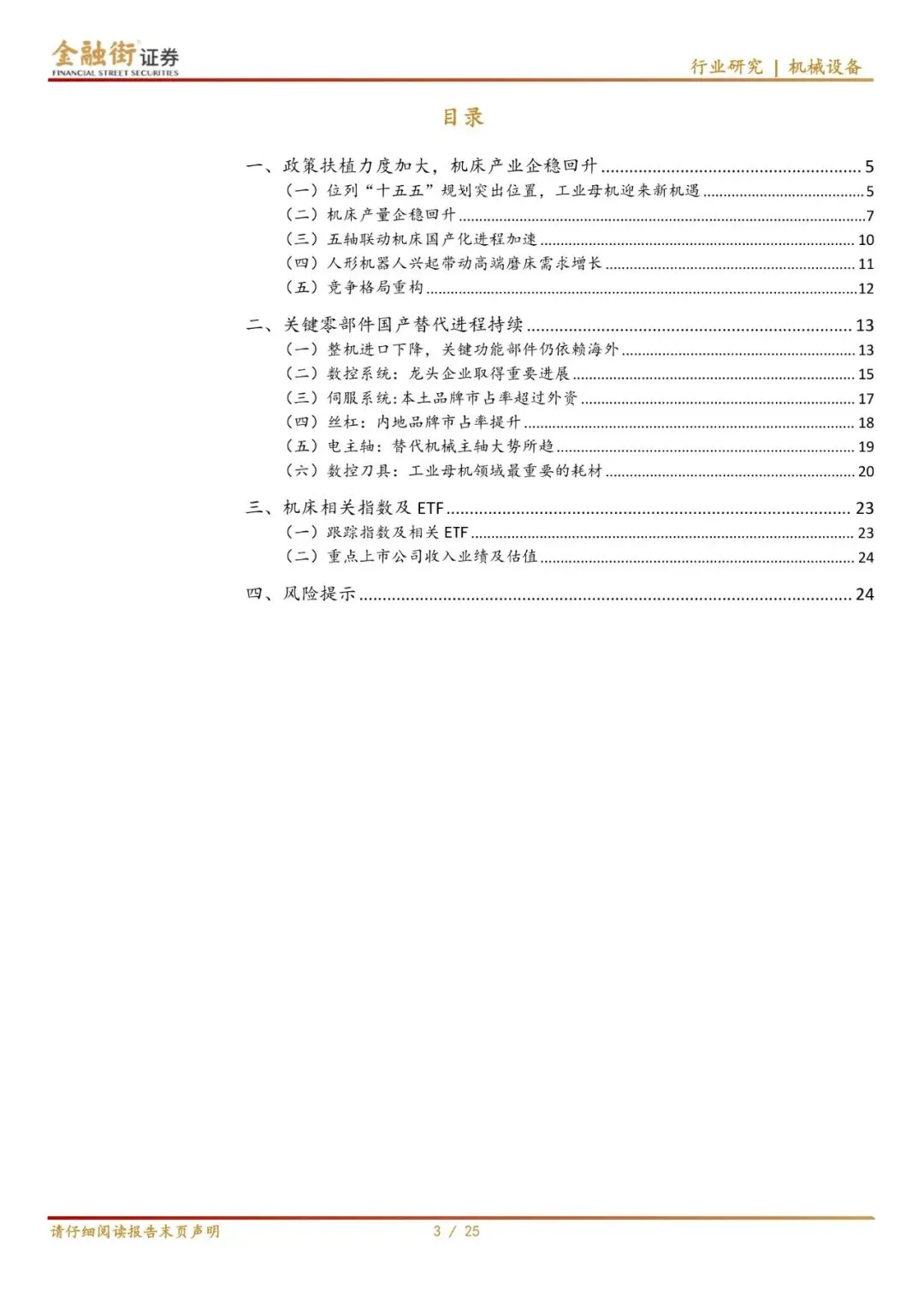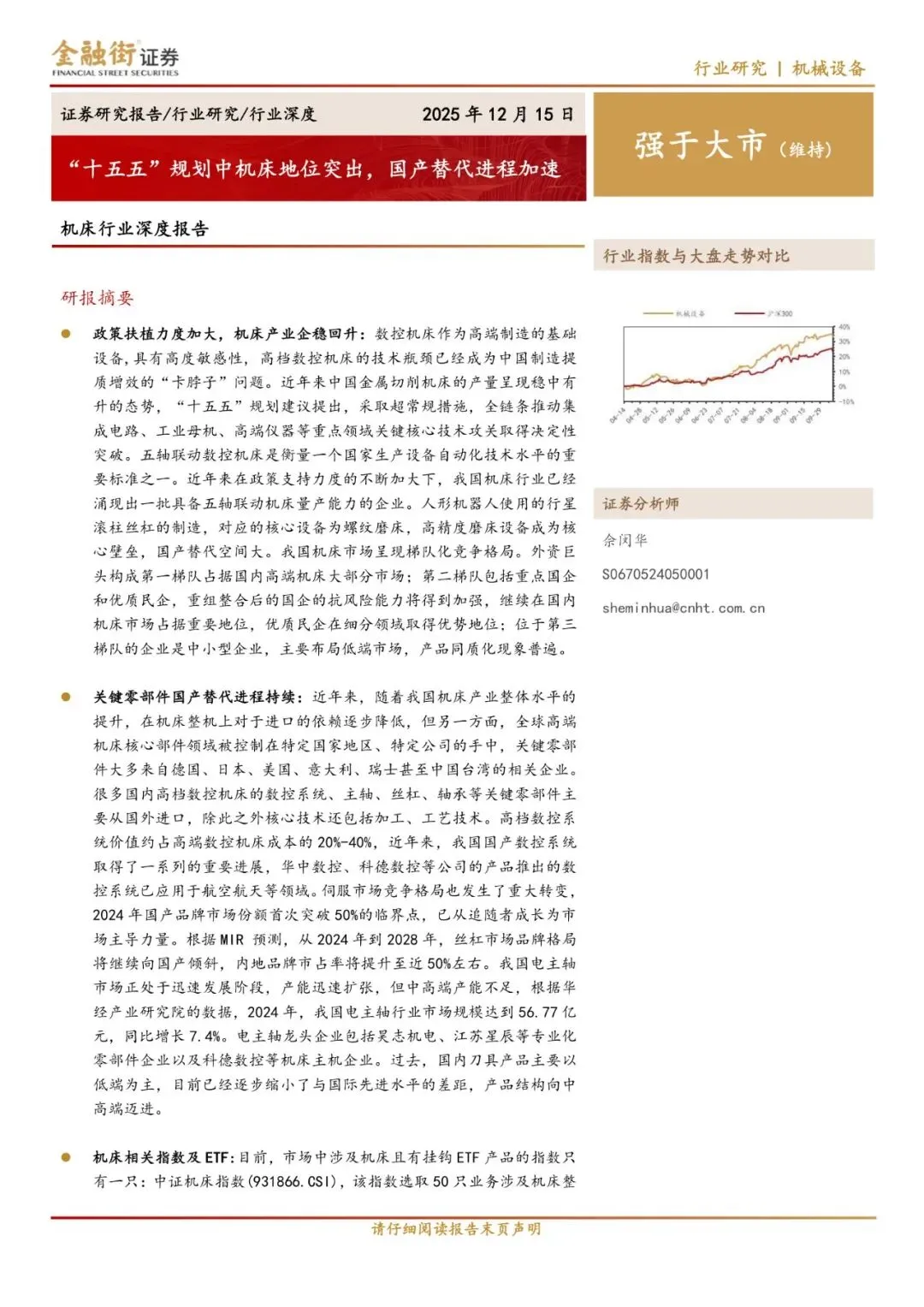 报告认为“十五五”将工业母机与集成电路、高端仪器并列为“超常规攻关”核心,政策强度空前;中国已连续13年稳居全球机床产值、消费额双第一(2024年产值273亿美元、消费246亿美元),但高端整机及核心部件仍受制于人。随着五轴联动、高精度磨床、数控系统、伺服、丝杠、电主轴、刀具等链条国产替代全面提速,2024年起行业进入“政策+更新需求+技术突破”三击共振的上行通道,国产厂商在第二梯队向第一梯队跃升,资本市场已推出两只ETF工具,板块配置价值凸显。