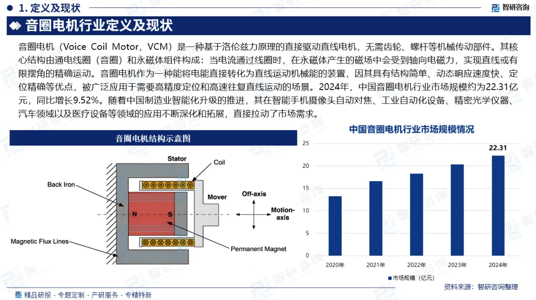 市场规模:音圈电机作为一种能将电能直接转化为直线运动机械能的装置,因其具有结构简单、动态响应速度快、定位精确等优点,被广泛应用于需要高精度定位和高速往复直线运动的场景。2024年,中国音圈电机行业市场规模约为22.31亿元,同比增长9.52%。随着中国制造业智能化升级的推进,其在智能手机摄像头自动对焦、工业自动化设备、精密光学仪器、汽车领域以及医疗设备等领域的应用不断深化和拓展,直接拉动了市场需求。