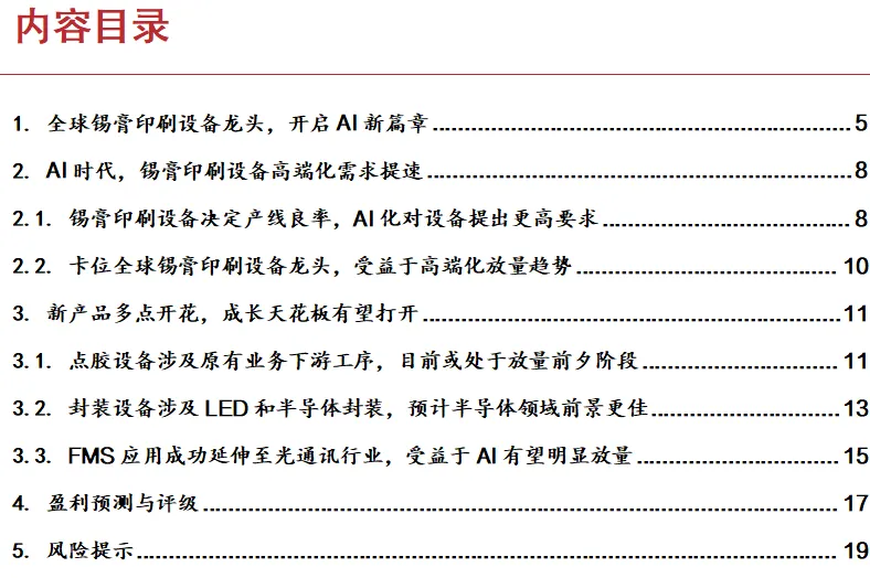 全球锡膏印刷设备龙头,开启AI新篇章。公司主业经营锡膏印刷设备,是2024年全球锡膏设备销售额最大的企业,公司成功进入华为、VIVO、苹果等全球头部客户供应链,成为其主力设备供应商。同时,公司积极拓展点胶设备、封装设备和柔性自动化设备,有望进一步提高成长天花板。