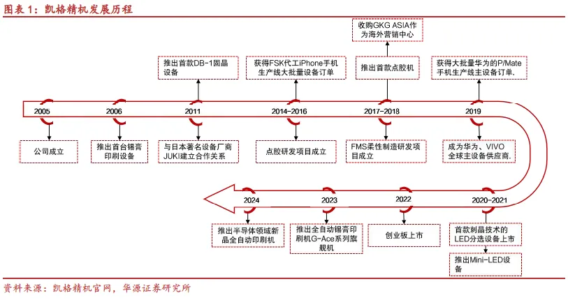 全球锡膏印刷设备龙头,完善多元化布局。公司成立于2005年,以锡膏印刷设备起家,2006年推出首款锡膏印刷设备,逐步成功切入苹果、华为、VIVO等全球头部客户供应链,成为其主力设备供应商,伴随新客户开拓和原有客户份额提升,公司锡膏印刷设备销售额稳步提升,于2020年成为全球锡膏印刷设备销售额最大的公司,一跃成为行业龙头。在主业发展期间,公司同时进行战略延伸和多元化布局,先后进入点胶设备、LED封装设备、固晶设备和柔性自动化设备等领域。