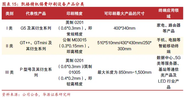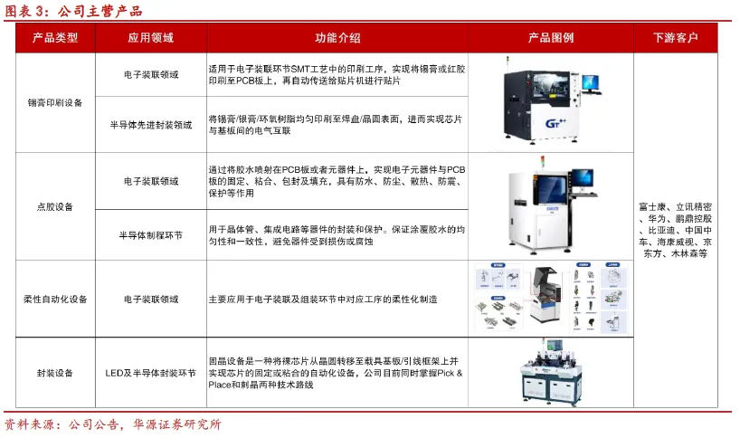 公司拳头产品为锡膏印刷设备,产品品类不断丰富。目前,公司产品涵盖锡膏印刷设备、点胶设备、柔性自动化设备和封装设备。其中,锡膏印刷设备、点胶设备及柔性自动化设备主要应用于电子工业制造领域的电子装联环节,下游应用广泛,可应用于消费电子、汽车电子、网络通讯、医疗器械、航空航天、智能家居等行业的生产制造。封装设备则主要应用于电子工业制造领域的封装环节及半导体封装环节,可应用于LED照明及显示器件、半导体芯片封装环节。目前,公司已与富士康、立讯精密、华为、鹏鼎控股、比亚迪、中国中车、海康威视、京东方、木林森等知名企业建立合作关系。面向第三代半导体,公司储备了SiC晶圆老化与KGD测试分选等关键设备,积极布局新的产品设备。