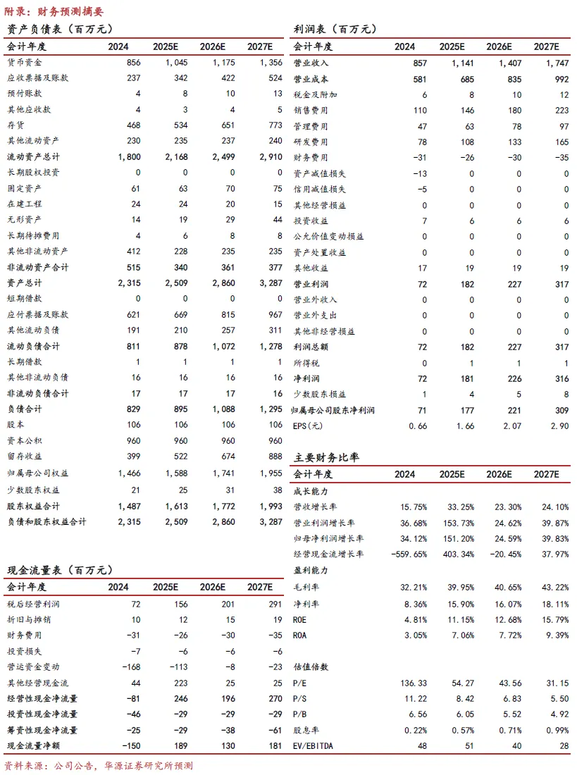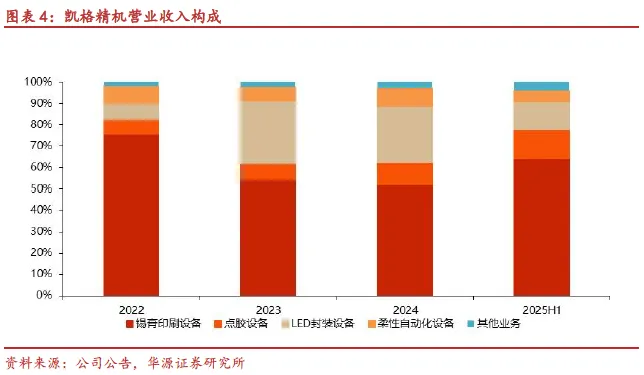 公司新产品多点开花,成长天花板有望进一步抬高。1)点胶设备:公司点胶设备主要应用于电子装联环节和半导体制程环节的点胶工序,为原有业务下游工序,目前或处于放量前夕阶段。截至2025H1,公司点胶设备业务收入占比为13%,收入同比增长26%;2)封装设备:公司产品主要包括LED领域固晶机和半导体封装环节固晶机,其中LED固晶机市场竞争较为激烈,半导体封装用固晶机处于布局期,预计未来发展空间较大;3)柔性自动化设备(FMS):主要应用于电子装联及组装环节中对应工序的柔性化制造,可帮助客户减少成本,同时实现设备效率最大化。当前公司已研发成功并批量交付800G光模块自动化组装线体,并于2025年上半年进一步推出1.6T光模块自动化组装产品线。