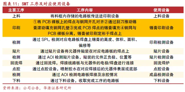 锡膏印刷机是SMT产线必备的自动化精密装备,电子产线中6成以上品质缺陷由锡膏印刷环节导致。锡膏印刷设备通过将锡膏印刷至PCB上,进而实现电子元器件与PCB裸板的固定粘合及电气信号连接,其中电子产线生产过程中六成以上的品质缺陷是由于锡膏印刷环节缺陷导致的。