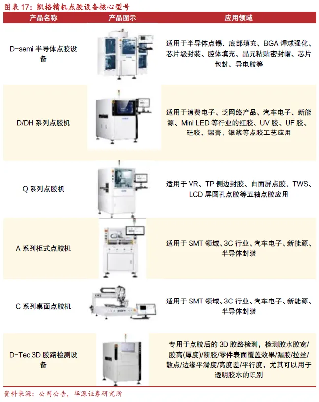 公司拓展原有业务下游工序至点胶设备领域。公司点胶设备主要应用于电子装联环节和半导体制程环节的点胶工序。电子装联环节主要是通过将胶水喷射在PCB板或者元器件上,实现电子元器件与PCB板的固定、粘合、包封及填充,具有防水、防尘、散热、防震、保护等作用,为电子装联的基础生产工序之一,对产品的品质、寿命等具有重要影响。此外,公司半导体点胶设备主要应用于晶体管、集成电路等器件的封装和保护。半导体行业对品质和可靠性要求极高,要求点胶机能够保证涂覆胶水的均匀性和一致性,避免器件受到损伤或腐蚀。