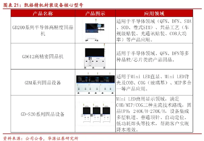 公司的封装设备主要应用于LED和半导体封装环节的固晶工序。固晶设备是一种将裸芯片从晶圆转移至载具基板/引线框架上并实现芯片的固定或粘合的自动化设备,公司同时掌握了Pick&Place和刺晶两种技术路线。公司当前封装设备覆盖从高精度半导体封装到新型显示封装领域。公司核心产品型号有:用于半导体封装及共晶工艺的高精度固晶机(GD200、GD612系列)、面向Mini LED直显和背光等多场景的GDM系列,以及适配Mini LED商用显示领域的GD-S20系列。