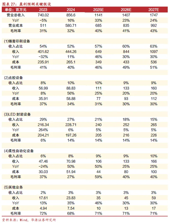 点胶设备业务:公司积极拓展原有主业的后道环节点胶设备,前期处于投入整合期,2024年开始该业务板块收入快速增长,我们预计2025-2027年点胶设备业务收入分别同比增长25%/20%/20%,毛利率分别为31%/30%/30%;