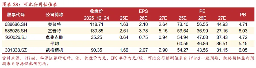 我们预计公司2025-2027年归母净利润分别为1.77/2.21/3.09亿元,同比增速分别为151.20%/24.59%/39.83%,当前股价对应的PE分别为54/44/31倍。我们选取奥普特、卓兆点胶、杰普特为可比公司,对应2025-2027年平均PE分别为61/47/37倍。鉴于公司主业锡膏印刷设备受益于AI产业趋势实现产品高端化升级,开拓的点胶和封装设备带来新增长极,首次覆盖,给予“增持”评级。