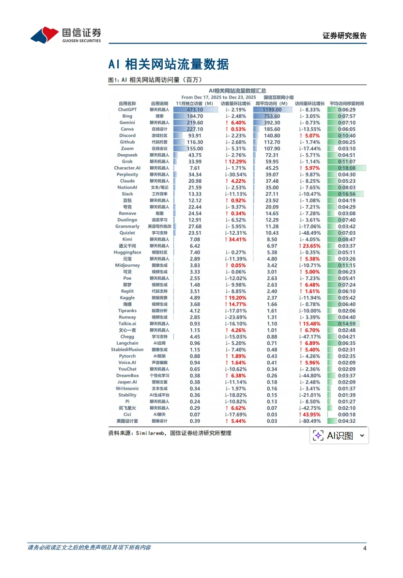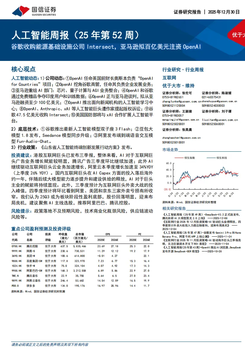 这份国信证券 2025 年第 52 周(2025 年 12 月 30 日发布)人工智能行业周报,聚焦全球 AI 行业动态、技术进展、政策导向及市场表现,给出投资建议与风险提示。报告显示,本周行业核心动态集中在巨头布局:OpenAI 推进人事调整、百亿级融资谈判及海外合作项目,谷歌收购能源基础设施公司 Intersect 并发布双子座 3 Flash 模型,亚马逊重组 AI 相关业务板块;同时,AI 巨头面临版权诉讼,海外市场用户争夺加剧。技术层面,豆包大模型 1.8、阿里 Fun-Audio-Chat 等新模型相继发布。政策端,《山东省人工智能终端创新发展行动方案》落地。市场流量方面,ChatGPT、Gemini 等头部 AI 应用保持较高访问量,部分应用呈现环比波动。投资建议上,报告指出 AI 对互联网巨头广告、云业务赋能显著,国内 AI 投入节奏滞后海外约一年,25Q3 或为板块盈利底部,推荐阿里巴巴、腾讯控股;同时提示政策落地不及预期、技术商业化瓶颈等风险。