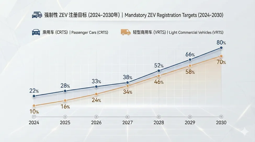 配额发放:根据“1 减去 ZEV 目标”的比例发放非 ZEV 配额。例如 2024 年乘用车 ZEV 目标为 22%,则主机厂获得其注册总量 78% 的非 ZEV 配额。