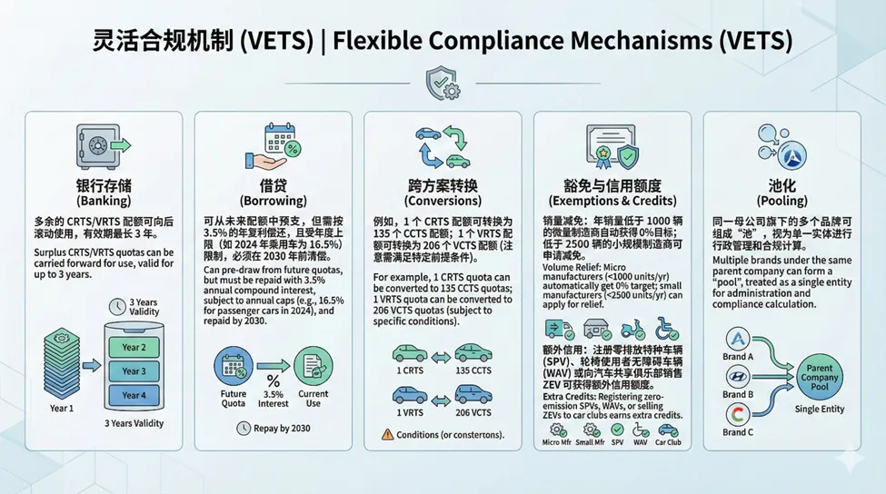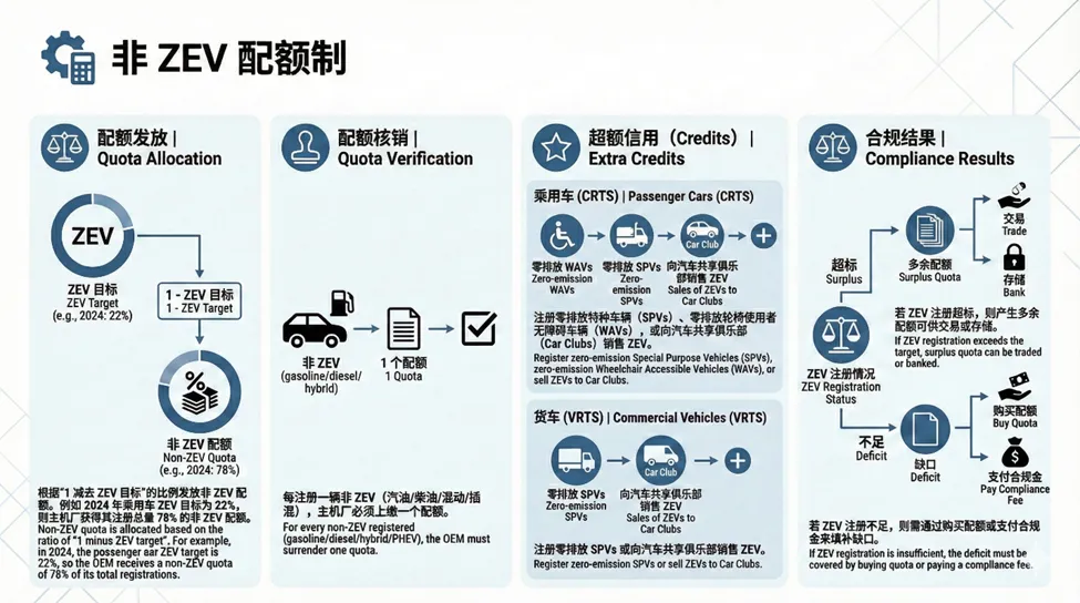 配额核销:每注册一辆非 ZEV(汽油/柴油/混动/插混),主机厂必须上缴一个配额。 超额信用 (Credits):主机厂可通过以下方式在 CRTS/VRTS 中获得额外信用额度: ○ 乘用车 (CRTS):注册零排放特种车辆(SPVs)、零排放轮椅使用者无障碍车辆(WAVs),或向汽车共享俱乐部(Car Clubs)销售 ZEV。 ○ 货车 (VRTS):注册零排放 SPVs 或向汽车共享俱乐部销售 ZEV。 合规结果:若 ZEV 注册超标,则产生多余配额可供交易或存储;若 ZEV 注册不足,则需通过购买配额或支付合规金来填补缺口。