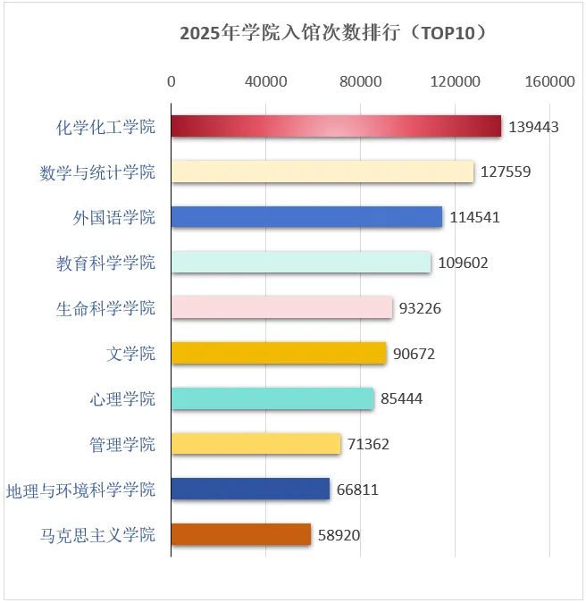 读者类型方面,本科生毫无悬念是入馆主力,入馆次数占总入馆量的48%。年级方面,2022级同学作为考研主力军,无疑是入馆次数最多的群体,占据入馆总数的近一半。排在其后的分别是2023级和2024级。 院系方面,化学化工学院的同学最喜欢来图书馆,其次是数学与统计学院和外国语学院。全校入馆人次最多的10个学院如下: