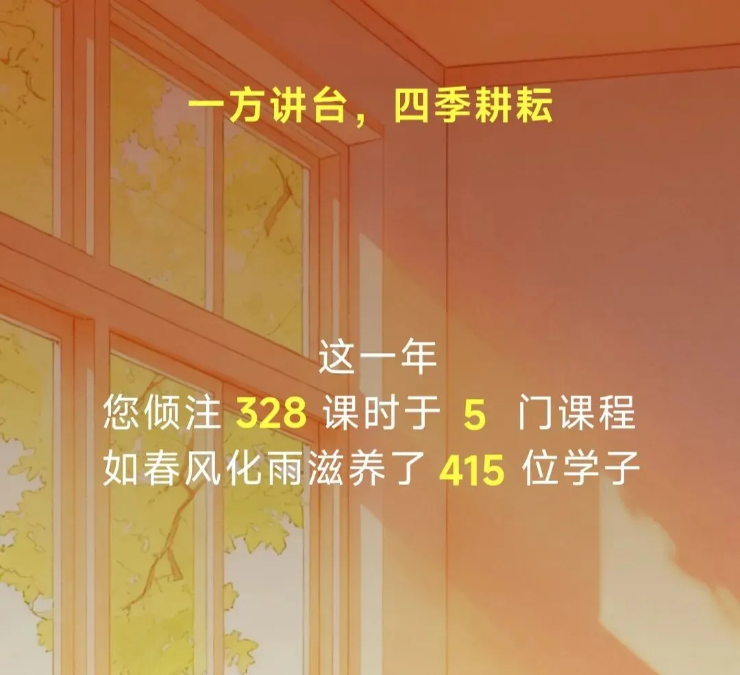 育人报告数据详解昨天的文章发布以后,JWC的老师特别联系我,给我科普了一下育人报告的数据是怎么来的,代表什么意思。 数据的统计时间是2024-2025学年,课时是从教务系统拉取的纯课时量,学生人数则是去重后的人数。 数据拉取过程中,部分人员的数据显示可能有些不准确,昨天[时光印记]的数据已经更新了,向寒假还在工作的同事们致敬! 我重新看了下,2024-2025学年我一共上了328个课时,有415名不同的学生选了我的课。 我们每年的课时量其实差不多,也就是说我五年的教学生涯中,已经教了差不多2000名同学,这个数字还是挺让我震撼的。