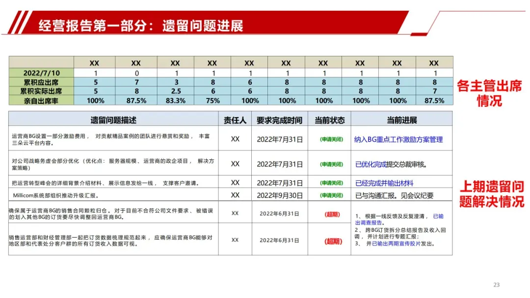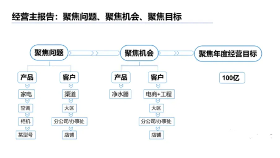 经营主报告的每一页都要直观地把核心经营问题暴露出来,让与会人员一眼就能看到核心的经营问题是,如哪些渠道、区域、终端或店铺、客户或项目类型、产品或应用场景有问题、问题有多大。