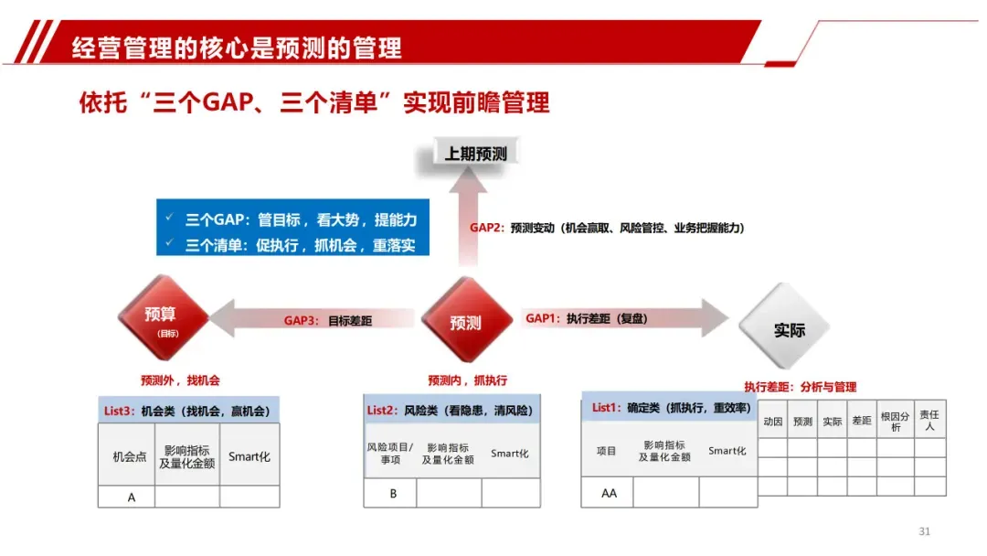 这是为了保证及时更新业务计划,拉动资源配置,提高资源的使用效率。滚动预测还要做三个GAP分析,帮助企业发现差距,尽早发现问题,做一些前瞻性的处理。