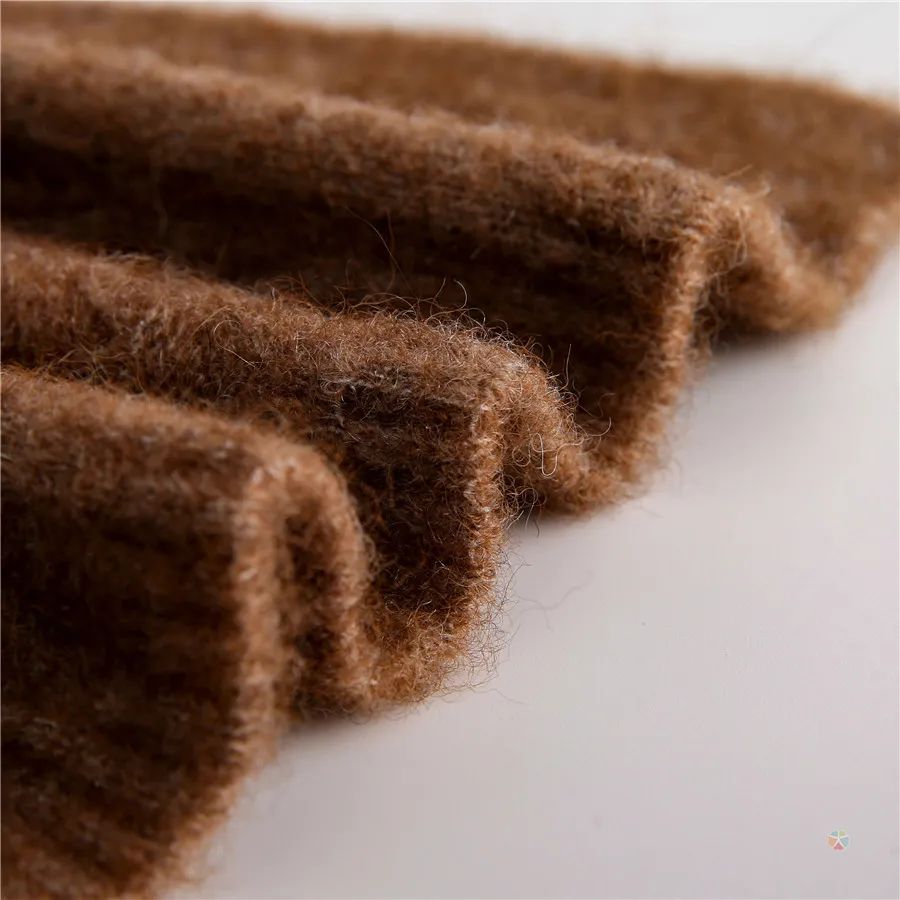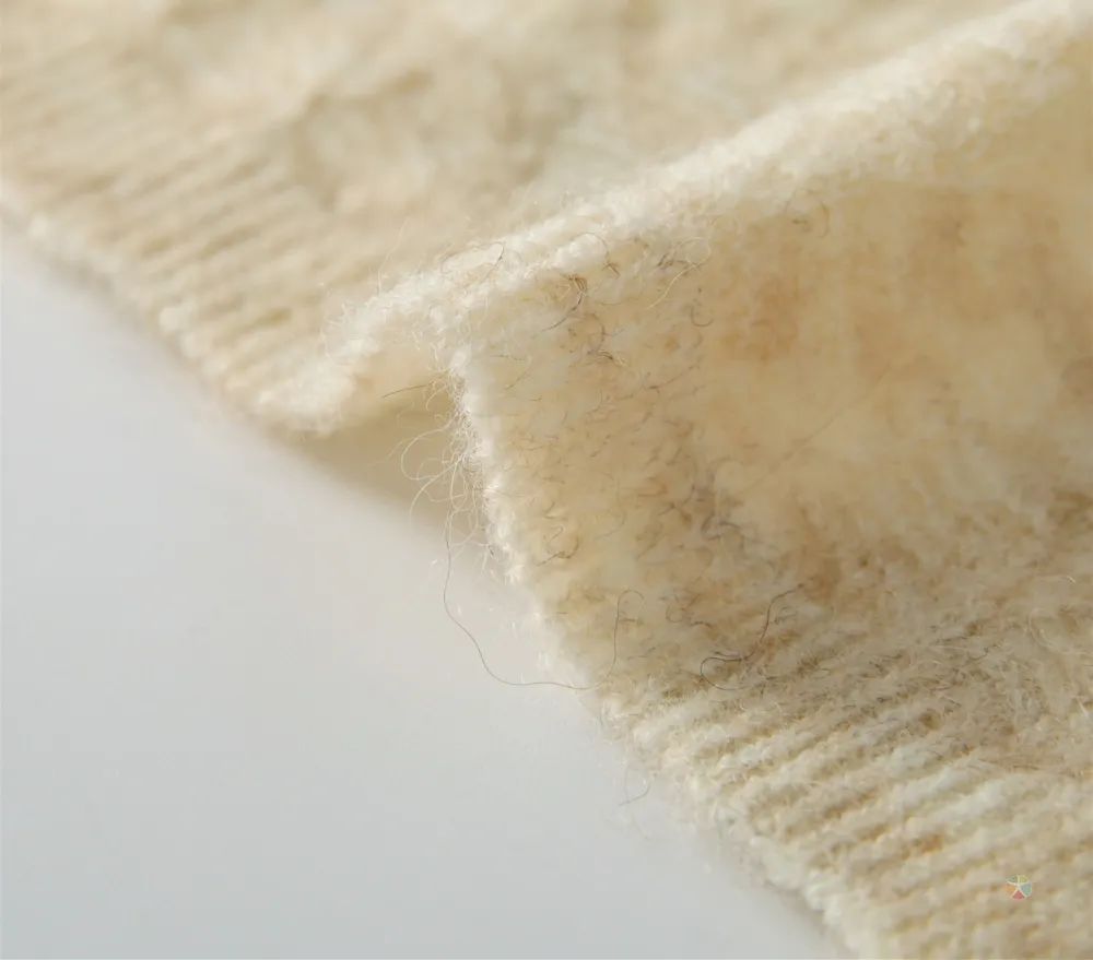 采用高品质羊驼毛纤维,羊驼毛比马海毛更细,更柔软,保暖性都要高于羊毛,而且软轻薄有弹性,光滑细腻,羊驼毛的保暖性佳。为了提高纱线手感和外观,纤维中加入羊毛,羊毛的回弹性好,可以增加面料舒适度。