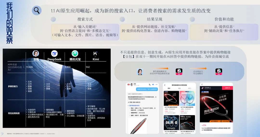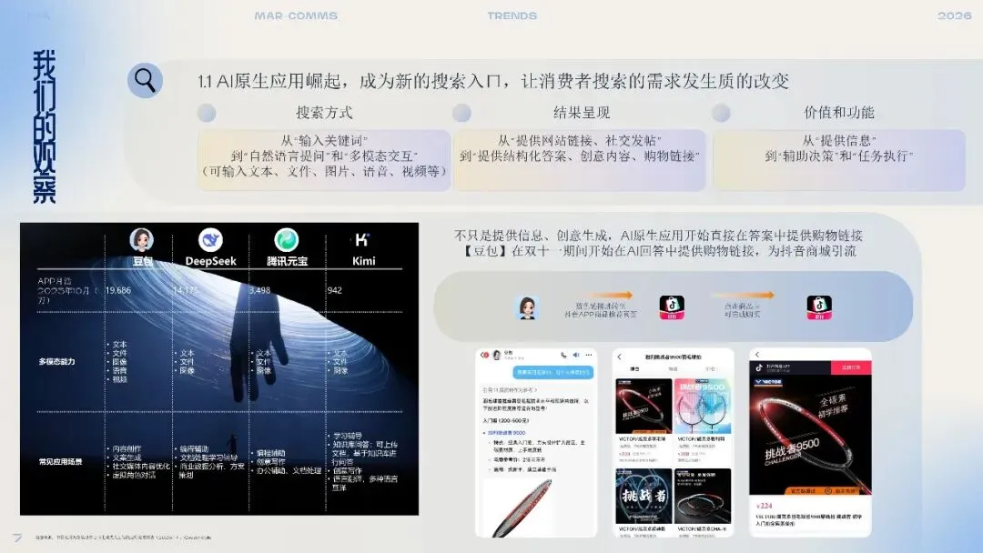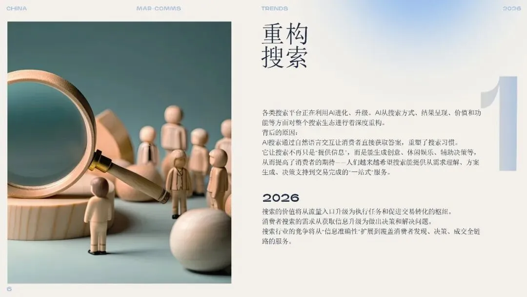 1. 搜索的重构:从信息入口到决策枢纽AI正在重塑搜索的本质。消费者不再满足于获取信息,而是期待搜索能直接提供答案、生成创意、辅助决策甚至完成交易。传统搜索引擎、社交平台和电商平台纷纷整合AI能力,形成“智能搜索生态”。品牌需布局生成式引擎优化(GEO),打造高信息密度的内容矩阵,确保在AI答案中占据关键位置,并实现跨平台的无缝转化。