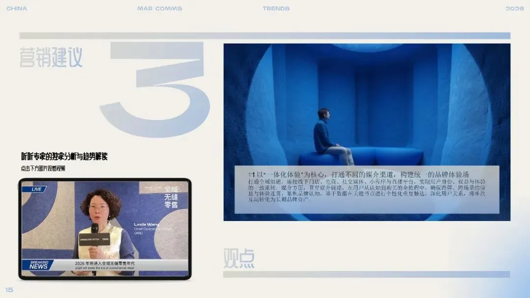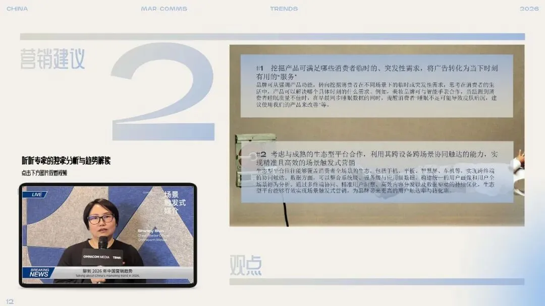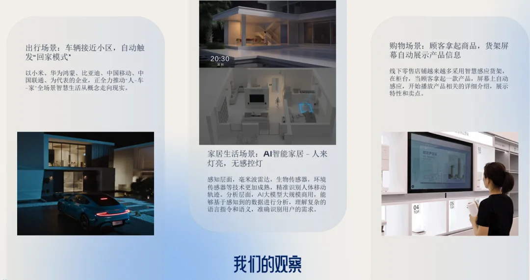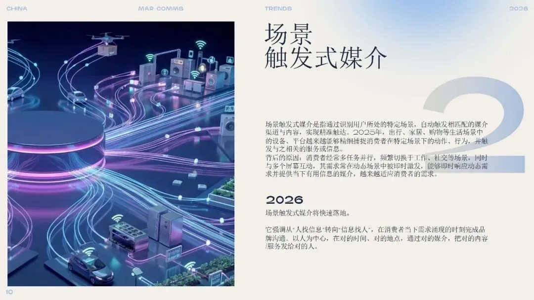 2. 场景触发式媒介:信息在对的时刻找到人随着物联网与感知技术的成熟,品牌可通过设备与平台识别用户所处场景(如出行、家居、购物),自动触发相匹配的内容与服务。营销逻辑从“人找信息”转向“信息找人”,强调在需求涌现的当下提供价值。品牌应思考产品如何满足临时性、突发性需求,并与生态型平台合作,实现跨场景的精准触达。