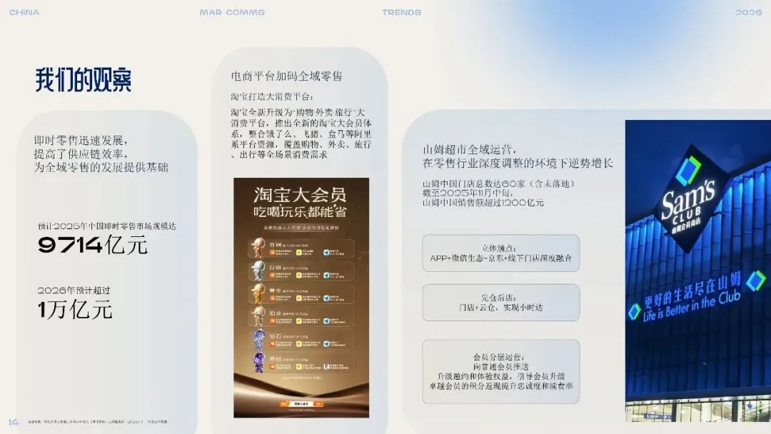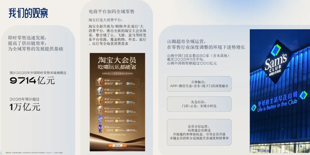 3. 全域无缝零售:体验高于渠道线上线下、公域私域的界限进一步模糊,“以消费者为中心的无缝体验”成为零售核心。即时零售持续渗透,电商平台向全域消费生态延伸。品牌需打破渠道壁垒,整合会员体系与服务链路,让购物成为随时可获的“状态”,而非特定场景的“任务”。