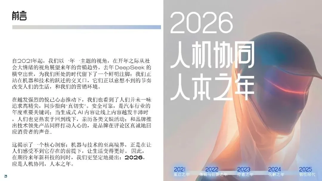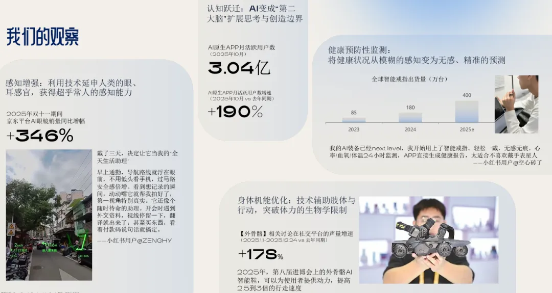 4. 增强人类:技术成为个性化成长伙伴消费者主动借助AI、可穿戴设备、生物技术等拓展自身能力边界,追求“更强的自己”。品牌沟通应从“说服购买”转向“赋能成长”,突出技术如何具体增强人的感知、认知与健康,并以人性化叙事避免技术冰冷感。