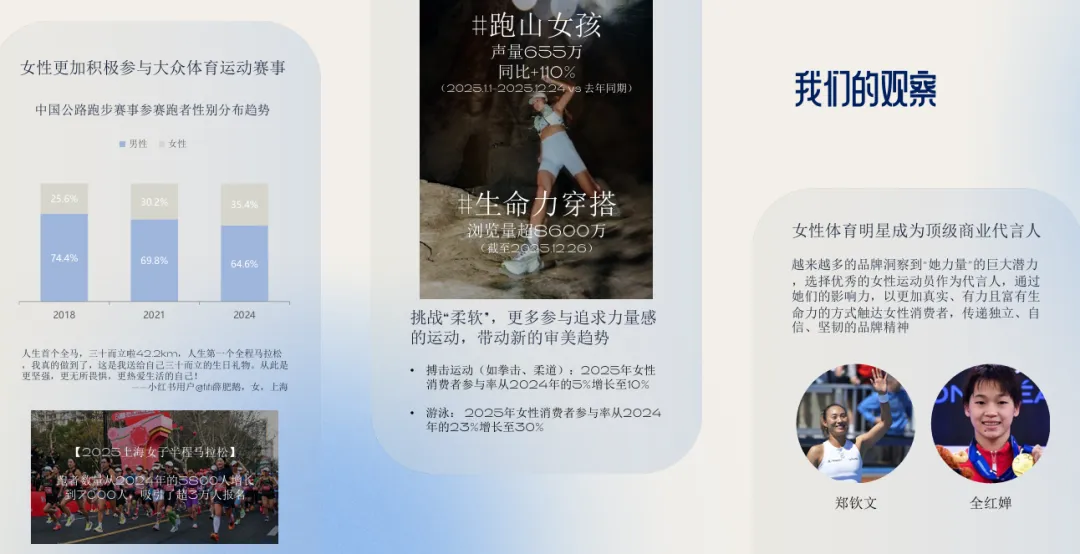 6. 她主场:女性重新定义运动与消费女性通过运动实现自我赋能,推动“体育女子力”浪潮。品牌需从女性视角优化产品设计(如特殊生理周期关怀),并借助社群运营与赛事共创,构建兼具归属感与能量的品牌场域。