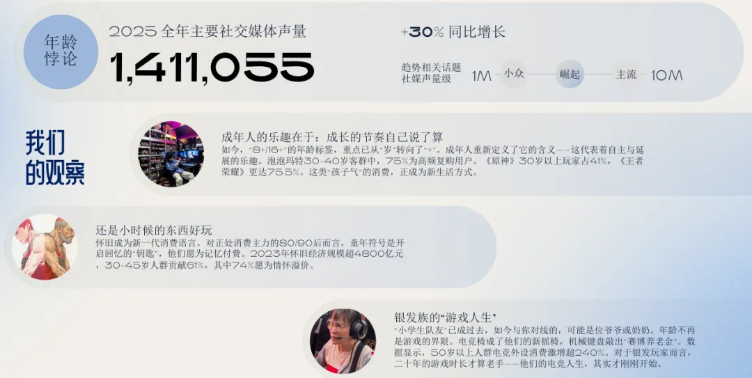 9. 年龄悖论:人生阶段由自己定义代际边界模糊,成年人主动融合“成人”与“孩童”的体验,怀旧经济与银发电竞崛起。品牌需在日常生活场景中唤醒玩心,与消费者建立跨越年龄的情感联结。