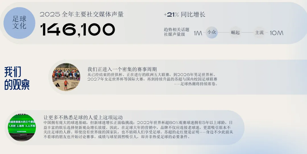 10. 足球大年:从赛事到文化狂欢2026世界杯将推动足球从体育赛事扩展为文化现象。品牌应超越传统体育营销,从娱乐、时尚、地域文化等角度切入,吸引非传统球迷参与这场全民狂欢。