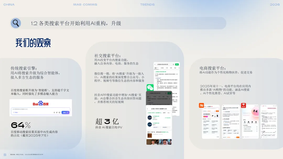 AI 原生应用崛起重塑搜索生态,从关键词输入到多模态交互,从信息提供到决策辅助,搜索已升级为交易转化枢纽,品牌需布局生成式引擎优化,抢占 AI 答案可见性。