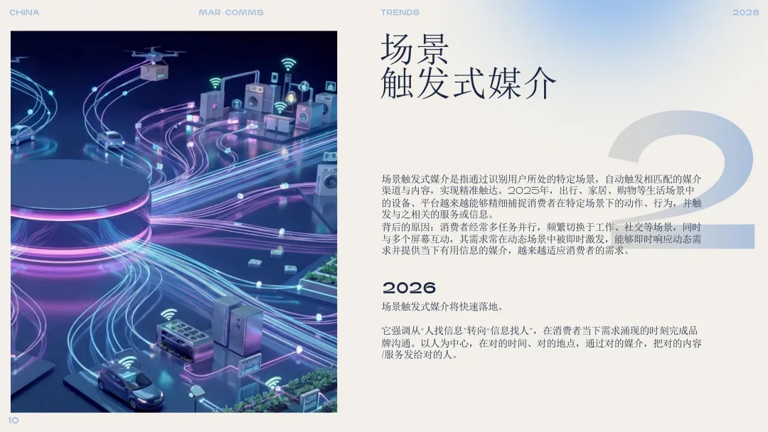 同时,场景触发式媒介快速落地,“人找信息” 转向 “信息找人”,小米、华为等生态平台推动 “人 - 车 - 家” 全场景触达,让营销在精准时机实现高效沟通。