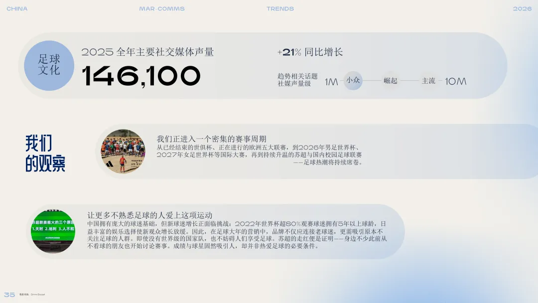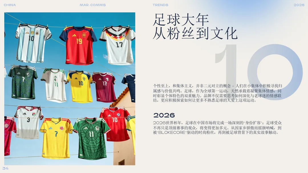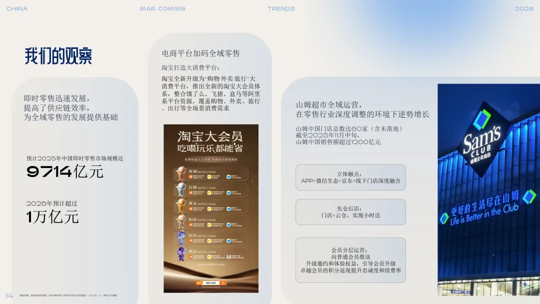 全域无缝零售加速落地,线上线下、公域私域深度融合,淘宝、山姆等平台构建全场景消费生态,即时零售市场规模预计突破万亿。品牌转向长期主义,既需为经典款注入个性表达,也需以持续创新与真诚叙事构建长期信任。2026 世界杯带动足球文化破圈,从赛事营销到潮流融合,成为品牌连接大众的重要契机。