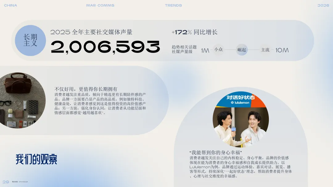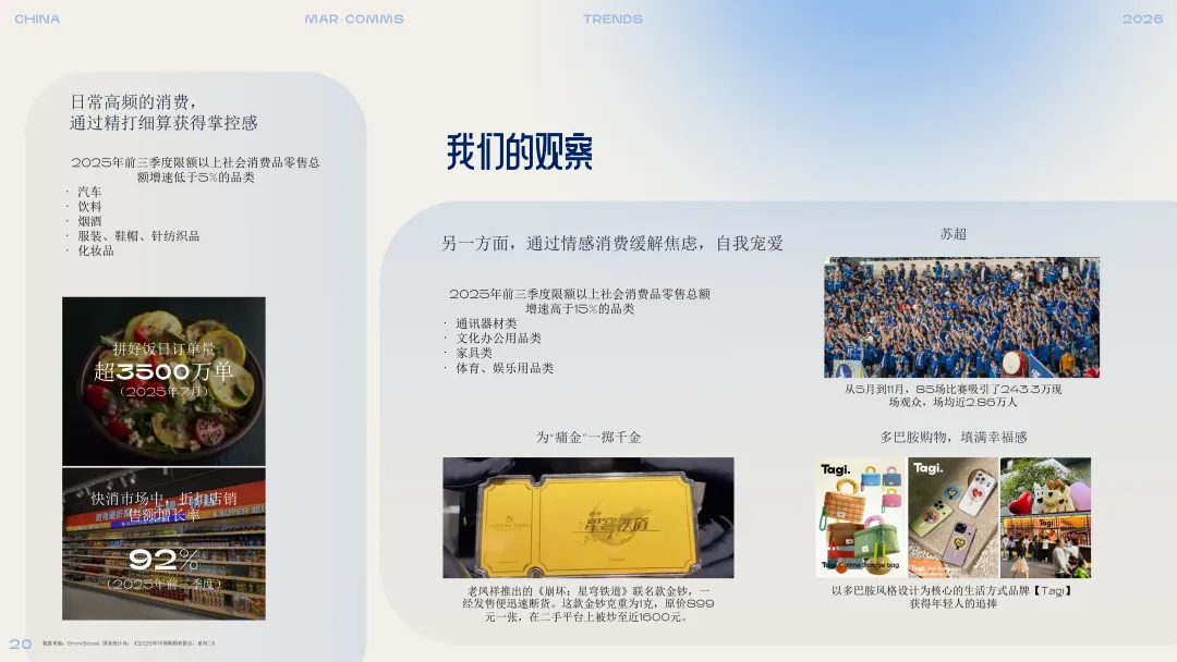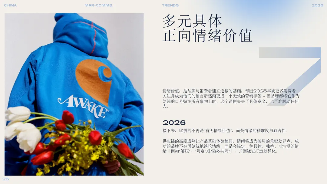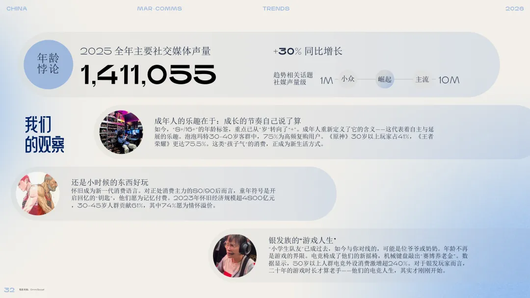 “理感双驱” 成消费常态,日常消费精打细算,却愿为情感共鸣支付溢价;“她主场” 趋势凸显,女性体育参与率飙升,“体育女子力” 成为品牌沟通新语言。情绪价值竞争进入深水区,笼统口号失效,精准、独特的正向情绪表达才能击穿用户心智。而 “年龄悖论” 打破代际边界,成年人重拾童心、银发族拥抱新潮,消费不再被年龄定义。