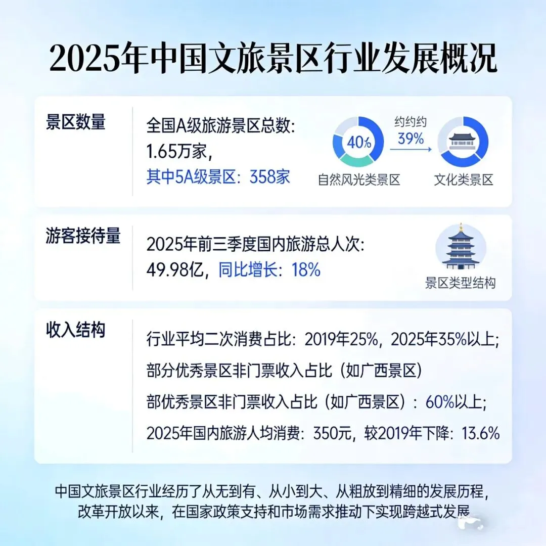 2025年,中国文旅景区行业在“十四五”规划收官之年展现出强劲的复苏态势和高质量发展特征。全国A级旅游景区总数达到1.65万家,其中5A级景区358家,形成了数量庞大、类型丰富、创新活跃的景区供给体系。