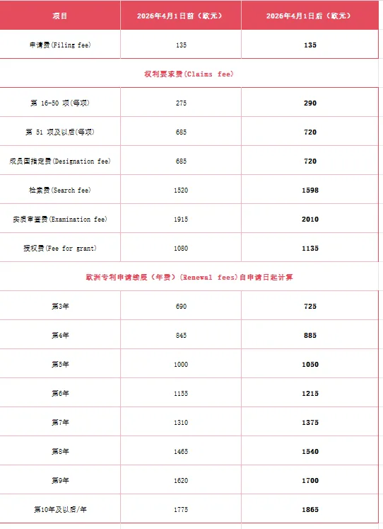 涵盖专利申请核心程序性费用,包括检索费、实质审查费、指定费(国家阶段指定相关)以及授权费,上述费用均为企业申请欧洲专利的刚性支出,上调后单案成本将增加数百欧元不等。