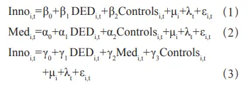 其中:模型(1)是基准回归模型,模型(2)—(3)是中介效应模型;Innoi,t表示i企业在t时期的合作创新;DED表示研发费用加计扣除政策优惠强度;Med分别表示企业风险承担能力(RiskT)和企业技术吸收能力(TAC);Controls表示其他可能的控制变量;μi为固定个体效应;λt为固定时间效应;εi,t为随机误差项;β0、α0、γ0为常数项;β1表示DED对合作创新的直接影响;β2表示控制变量对合作创新的影响;α1表示DED对中介变量的影响;α2表示控制变量对中介变量的影响;γ1表示DED对合作创新的间接影响;γ2表示中介变量对合作创新的影响;γ3表示控制变量对合作创新的影响。