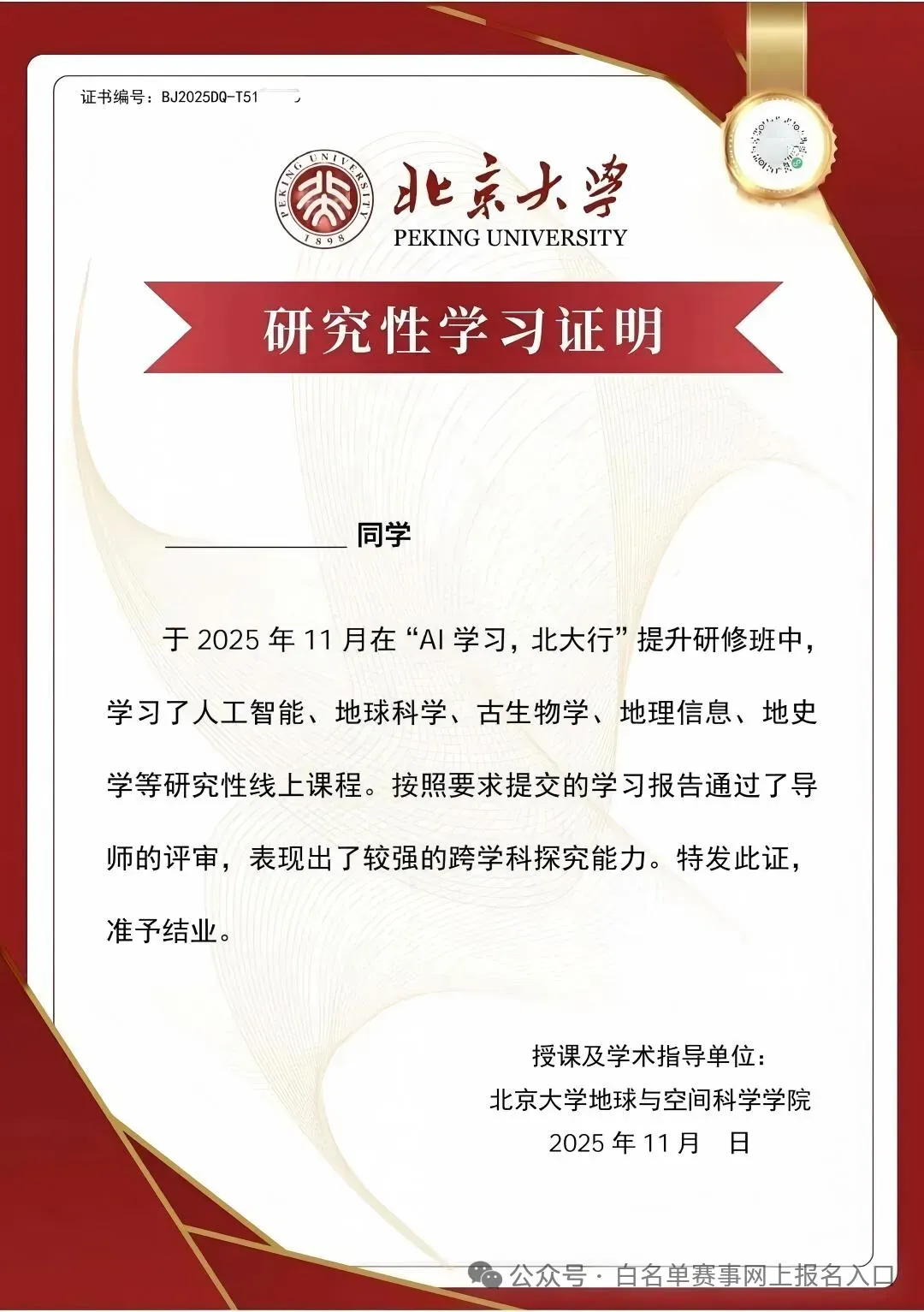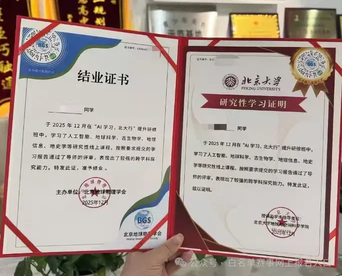 项目由北京大学地球与空间科学学院联合北京地球物理学会主办,证书由双方共同盖章颁发。北京大学作为国内顶尖高校,其学术声誉和专业认可度为项目提供了坚实支撑,使证书具有较高的权威性和可信度。