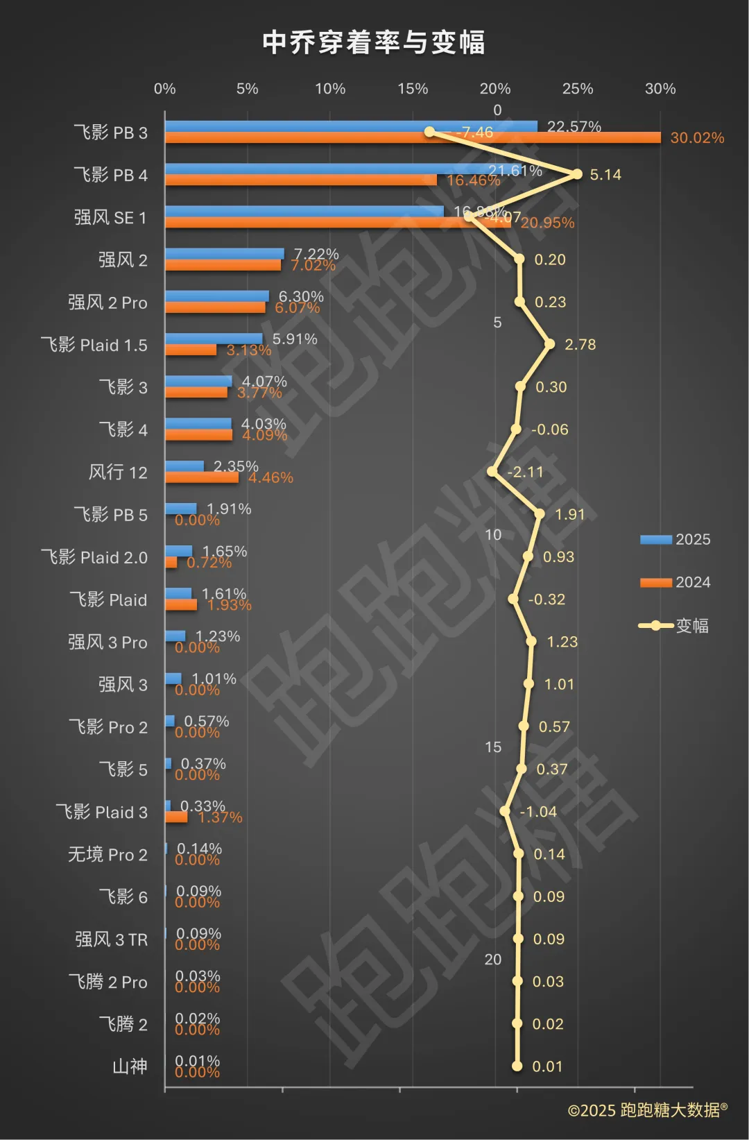 这两代产品合计占据超 44% 的份额,凸显了飞影 PB 系列作为中乔“现金牛”和“流量入口”的绝对核心地位。它们主要面向追求比赛成绩突破、对价格敏感的精英,及严肃进阶跑者,是“破三”阵营中的高性价比选择。