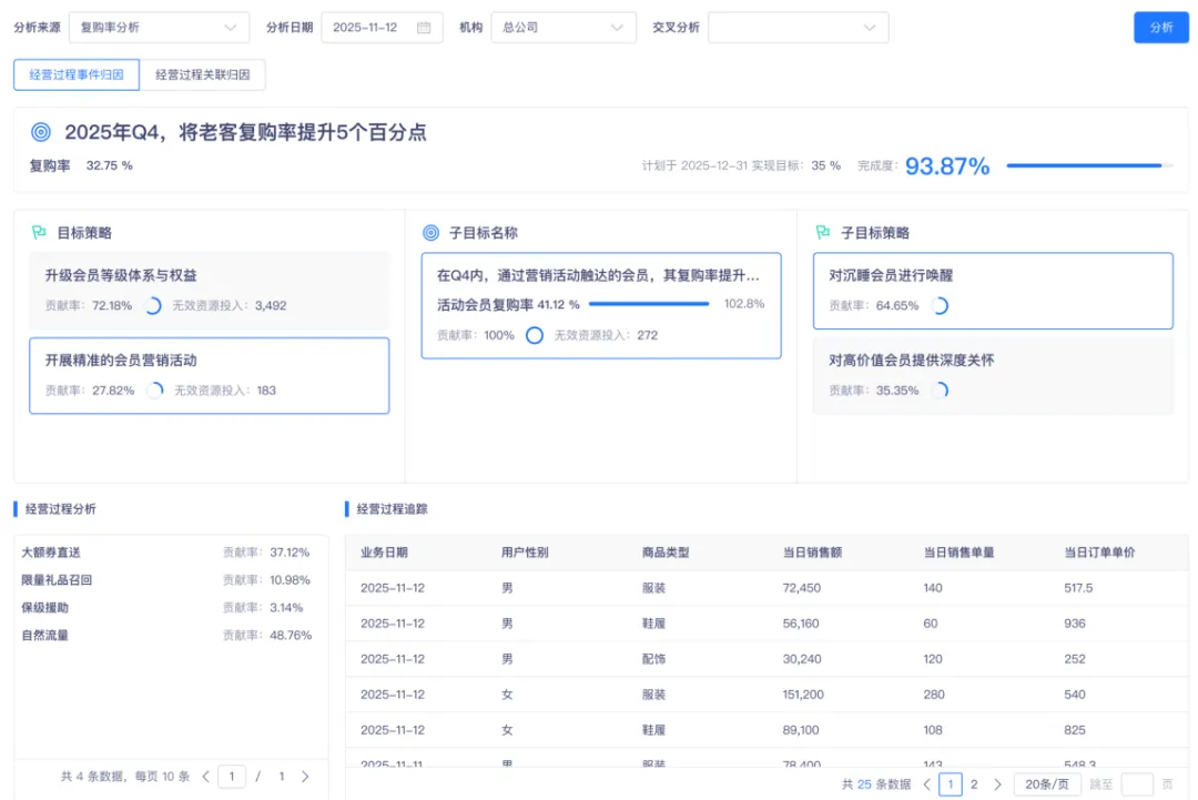 围绕管理与决策场景,2025 年 AIMetrics 在指标体系之上进一步延展了目标与策略类能力,支持将核心经营目标分层拆解为可追踪的指标体系,并与策略动作、责任归属、过程监控与复盘评估进行关联。在与中国银联客户的共创过程中,我们围绕指标口径统一、目标分解路径、策略动作沉淀、过程追踪与复盘机制等环节持续迭代,形成了更贴近大型组织经营协同的使用方式,使指标不止用于“看数”,也可用于“管事”。