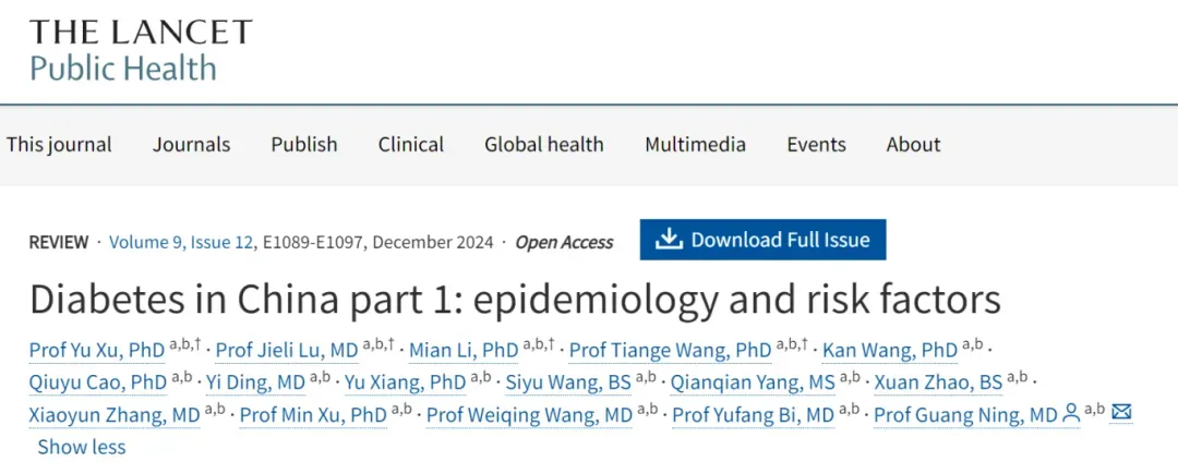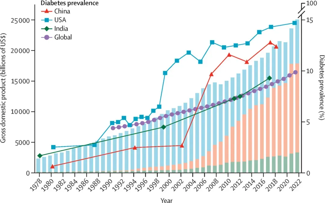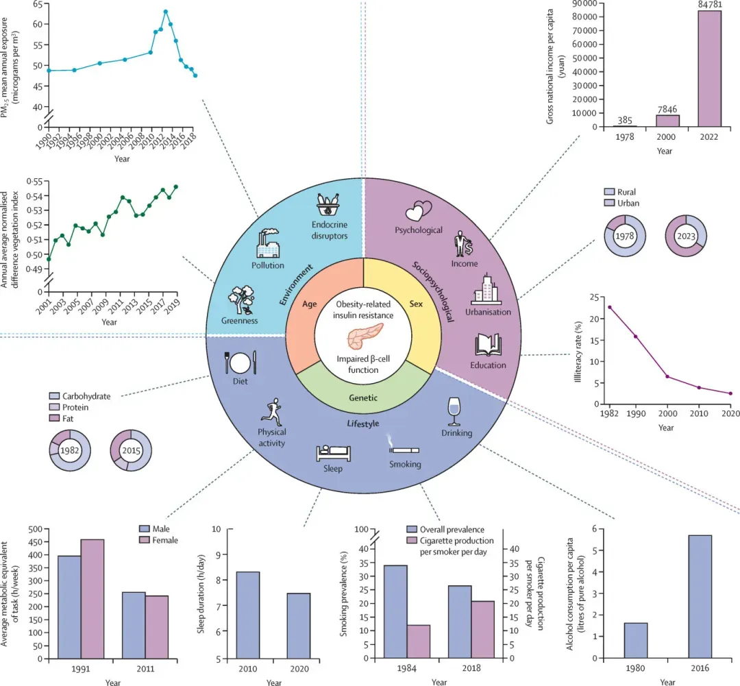 2024年12月,上海交通大学医学院附属瑞金医院团队于THE LANCET Public Health发表题为《中国糖尿病(第一部分):流行病学与危险因素》研究报告,通讯作者为上海交通大学医学院附属瑞金医院院长、上海市内分泌代谢病研究所所长、上海市内分泌代谢病临床医学中心主任和国家代谢性疾病临床医学研究中心主任宁光院士。报告指出,糖尿病作为一种全球性健康挑战,全球患病人数在2021年已达到5.29亿,预计到2050年将影响13.1亿人。中国是全球糖尿病患者数量最多的国家,超过1.18亿人患有糖尿病,占全球糖尿病患者的约22%。自20世纪70年代末以来,中国经历了深刻的变革和快速的经济增长,生活方式的转变导致了超重和肥胖的增加,这些因素与胰岛素抵抗和糖尿病的发生密切相关。3.导致中国糖尿病患者死亡前三大原因分别是心血管疾病、癌症和糖尿病酮症酸中毒/昏迷;中国糖尿病患病率:从“1980年的<1%”到“2018年的12.4%(中国大陆,≥18岁)”报告指出,自1980年以来,中国糖尿病患病率从不到1%迅速增加,2018年的数据显示,中国大陆18岁及以上成人糖尿病患病率为12.4%。此外,糖尿病的分布在中国存在显著的地区差异,东部地区患病率最高,西部地区最低,与各地区的经济发展水平相平行。报告指出,全球糖尿病患病率自20世纪90年代以来一直在上升,这一趋势与全球国内生产总值(GDP)的同期增长相一致。随着中国经济的快速增长,中国的糖尿病患病率也出现了迅速上升。尤其在2000年之后,中国的GDP和糖尿病患病率急剧增加,相比美国GDP和糖尿病患病率的相对稳定增长以及印度GDP和糖尿病患病率的持续较低水平(图1)。此外,糖尿病在中国的分布存在显著差异。根据作者团队和中国疾病预防控制中心2010年进行的全国调查数据,中国东部、中部和西部的估计患病率分别为13.2%、11.2%和9.7%,与这些地区的经济发展水平相关联。图1 1978 年至 2022 年全球糖尿病患病率和国内生产总值的趋势(中国、美国和印度)中国Kadoorie生物银行(CKB)研究在2004年至2008年间从中国十个地区招募了482,589名无糖尿病的中国成年人,经过9.2年的随访,总体糖尿病发病率为每10万人年314例。CKB数据显示,随访后城市和农村地区的发病率相似(320 vs 312每10万人年),与基线时城市地区糖尿病患病率高于农村地区的状况形成了明显对比。中国儿童和青少年(即18岁以下个体)的2型糖尿病也在上升。一项基于医院出院记录的大型回顾性多中心研究显示,18岁以下患者2型糖尿病的患病率从1995-2000年的每10万人4.5例增加到2005-10年的每10万人9.1例。2024年对中国3至18岁学龄儿童的全国调查估计,2017-19年2型糖尿病的患病率为每1000人1.77例,大多数未被诊断。此外,糖耐量受损的患病率为每1000人28.46例,空腹血糖受损的患病率为每1000人53.74例。这些糖尿病前期数据与全球儿童和青少年的汇总患病率相当。中国2型糖尿病患者中,高血压和血脂异常是常见的合并症。全国性横断面调查显示,52.2%的中国成年糖尿病患者收缩压超过140mmHg,46.8%的患者低密度脂蛋白胆固醇超过100mg/dl。据估计,14.9%的中国门诊2型糖尿病患者患有心血管疾病,约21.3%的糖尿病患者被归类为患有慢性肾病。糖尿病视网膜病变的患病率为16.3%,视力威胁性糖尿病视网膜病变的患病率为3.2%。这些并发症随着糖尿病病程的延长和代谢控制的恶化而增加,包括血糖、血脂浓度和血压的控制。此外,一项针对中国60岁及以上个体的全国调查报告称,轻度认知障碍患者的糖尿病患病率为26.0%,痴呆患者的糖尿病患病率为36.9%。2型糖尿病还使中国人的抑郁症风险翻倍,一项对48份报告中的108,678名参与者进行的荟萃分析显示,约25.9%的糖尿病患者共病抑郁症。糖尿病并发症的患病率也存在地区差异。一项对居住在中国七个地理区域的219,522名2型糖尿病患者的研究报告称,冠心病和中风综合患病率在东北地区最高(19%),在西南地区最低(10%)。北方的糖尿病视网膜病变患病率为18.1%,南方为14.4%。报告指出,2型糖尿病及其相关并发症的高患病率带来了巨大的挑战。与没有糖尿病的成年人相比,中国患有糖尿病的成年人全因死亡风险翻倍,前三大死因分别是心血管疾病、癌症和糖尿病酮症酸中毒/昏迷。此外,尽管城市地区的糖尿病患病率较高,但农村地区的糖尿病患者全因死亡风险高于城市地区。从1990年到2017年,糖尿病导致的寿命损失年增加了55.3%,从1990年的每10万人139例增加到2017年的每10万人215例,使糖尿病在2017年成为中国残疾调整生命年(DALYs)的第八大原因。糖尿病大流行的背后推手——胰岛素抵抗与糖尿病发病关联更强!胰岛素抵抗和β细胞功能障碍是2型糖尿病发病的关键机制。在东亚人群中,既往2型糖尿病被认为主要是由β细胞功能障碍而非胰岛素抵抗驱动的。然而,2020年的一项研究纳入了94,952名中国非糖尿病成年人,结果显示在中位随访时间3.1年期间,胰岛素抵抗对糖尿病发病的人群归因风险百分比是β细胞功能障碍的两倍,表明胰岛素抵抗与糖尿病发病的关联更强,贡献更大。此外,一项涉及不同种族背景参与者的队列研究的荟萃分析报告称,东亚人的β细胞功能低于白人,但他们的β细胞相对于胰岛素抵抗的反应是相似的。这些初步发现可能挑战了β细胞功能障碍是中国糖尿病主要病理生理的常规印象,但仍需通过直接测量胰岛素分泌和胰岛素敏感性的研究来进一步确认。此外,中国2