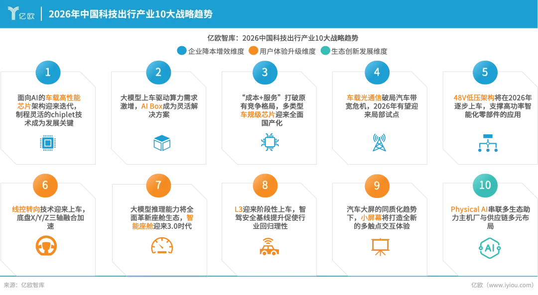 在智能化、电动化与人工智能技术加速融合的浪潮下,中国科技出行产业正迎来一场深刻的系统性变革。在全球汽车产业竞争加剧、技术迭代加速、价格压力与盈利模式重塑并行的背景下,产业正由增量扩张阶段转入以效率、规模与体系能力为核心的高质量发展阶段。基于对产业链长期跟踪研究、与行业专家以及多家企业的深度调研交流,亿欧汽车研究院持续多年发布科技出行与汽车智能化相关技术趋势报告,形成了对产业演进路径的系统性洞察。在此基础上,亿欧汽车重磅发布《2026中国科技出行产业10大战略技术趋势展望》报告,旨在为产业链决策者提供一份面向未来的关键行动指南。本报告从企业降本增效、用户体验升维、生态协同创新三大战略维度出发,深度解构 2026 年产业竞争格局重塑背后的核心技术驱动力。