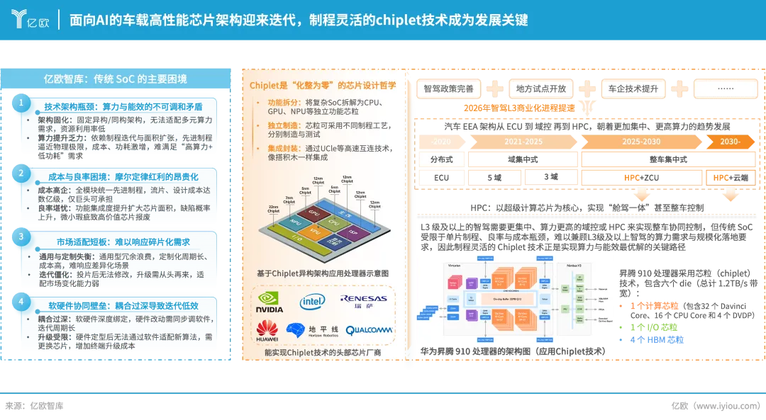 传统单芯片 SoC 已难以支撑 L3+ 自动驾驶与大模型座舱对算力、功耗和迭代效率的综合要求,车载高性能芯片架构正进入重构周期。Chiplet 通过“化整为零、异构集成”的设计思路,将 CPU、GPU、NPU 等功能模块解耦,并匹配不同制程与工艺,实现算力按需扩展、成本结构优化与开发节奏加快。随着 2026 年 L3 自动驾驶的逐步落地、车端算力需求进一步放大,Chiplet 架构有望从高端车型率先落地,逐步演变为高性能智驾芯片的主流方案,成为支撑智能汽车“超级大脑”的关键底座。