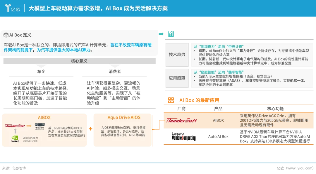 从应用路径看,AI Box 初期主要承载智能座舱相关的大模型推理任务,如语音、多模态交互等;随着算力密度与带宽能力提升,其应用范围可能向智驾等核心场景扩展。