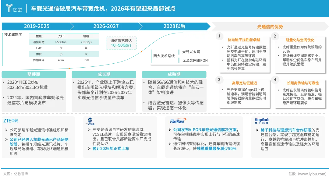 从产业节奏看,2019–2025年处于标准与产品验证期,IEEE标准发布、车规级芯片与模块落地,为工程化奠定基础;2026–2027年进入局部试点与量产导入窗口,通信带宽可达10–50Gb/s,头部车企开始在特定高端车型或子系统中尝试光通信架构;2028年以后,随着5G/6G、AI与“车—云—一体”架构深化,车载光通信有望与传感器体系深度融合,迈向成熟期。
