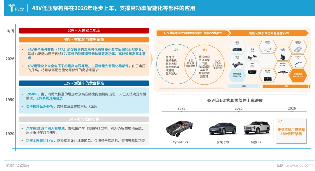 随着新能源汽车进入深度智能化阶段,高功率智能部件持续上车,12V系统面临系统高效率运行和支撑物理功率需求的瓶颈。产业演进路径呈现出清晰的渐进式替换逻辑:短期内以“12V主配电 + 部分48V高功率部件优先上车”为主,重点覆盖线控转向、主动悬架、高性能热管理等场景;中长期则有望向48V主配电网络演进。从落地节奏看,48V零部件已率先在特斯拉Cybertruck等车型验证可行性,2025年开始在蔚来ET9、极氪9X等高端车型中规模应用,2026年成为更多旗舰车型导入48V低压架构的关键节点。